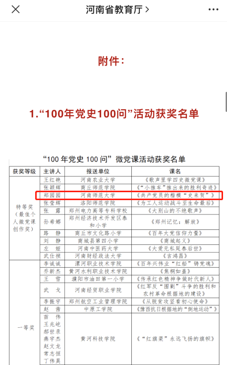 近日,中共河南省委高校工委、河南省教育厅、河南广播电视台公布庆祝建党100周年“100年党史100问”河南微党课活动获奖结果,我院教师郑园园主讲的微党课《共产党员的楷模:史来贺》荣获特等奖第三名,特向全院师生报喜。