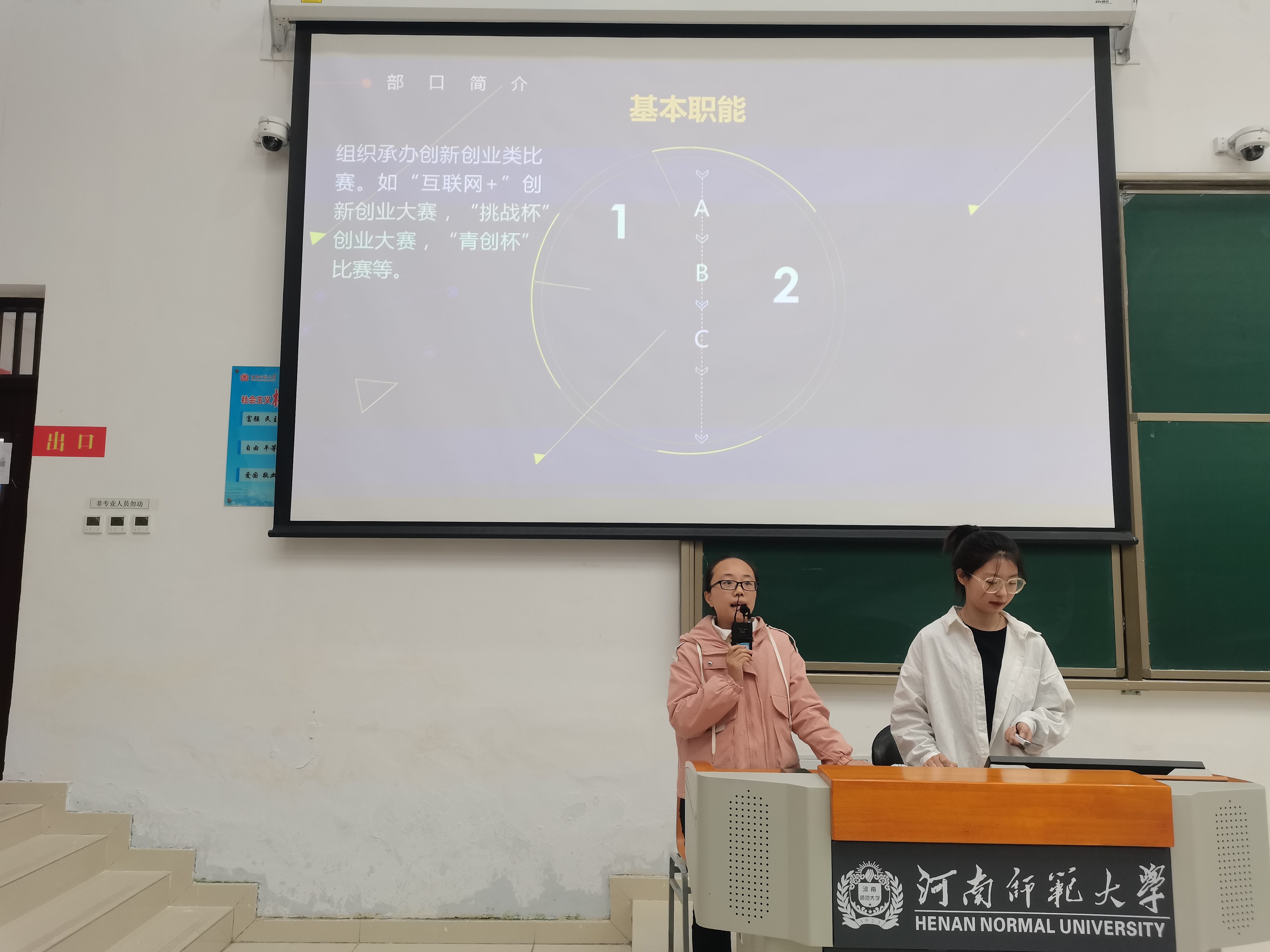 10月17日上午,商学院于文昌楼102教室举行2021年团委、学生会及院社联部口推介大会。2020级辅导员郑园园,团委、学生会及院社联全体学生干部及2021级新生参加本次大会。