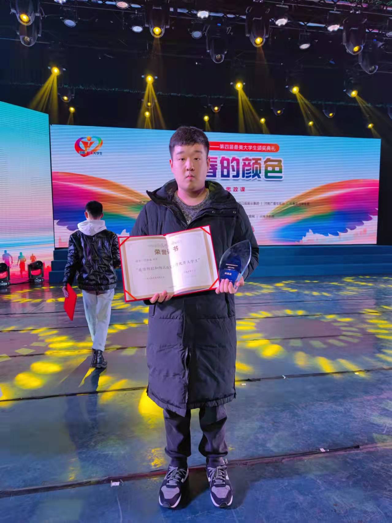 12月17日,由河南省高工委、省教育厅举办的“出彩河南人”第四届最美大学生、疫情防控和防汛救灾工作优秀大学生颁奖典礼暨“青春的颜色”主题思政课在郑州西亚斯学院举行,近百万人线上线下同步参与了这堂洋溢着青春色彩的思政大课。在这堂思政大课上,我院2018级本科生何银磊和来自其他高校的共计25名大学生获得了“疫情防控和防汛救灾工作优秀大学生先进个人”荣誉称号。