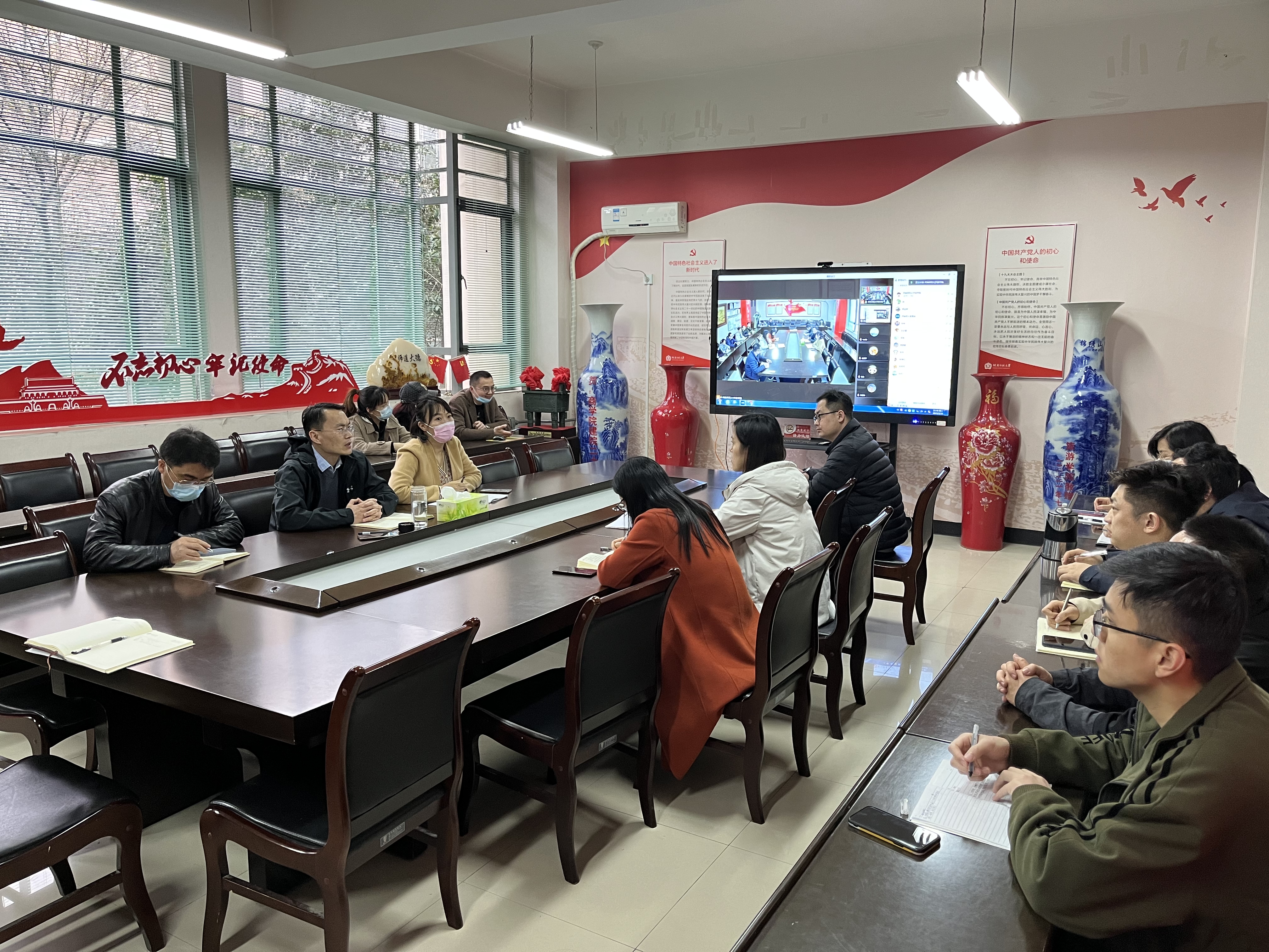 为减少人员聚集,在校的学院领导班子、科级干部及全体辅导员参加会议,未到校人员通过腾讯会议线上参加了会议。