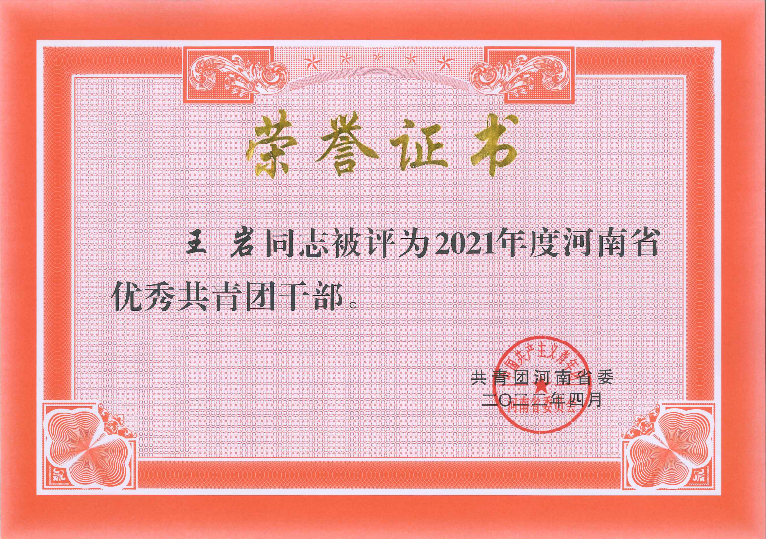 近日,河南省教育厅下发了《河南省教育厅办公室关于开展全省高校思想政治工作奖评选的通知》,共青团河南省委下发了《关于申报2021年度“河南省五四红旗团委(团支部)”“河南省优秀共青团员”“河南省优秀共青团干部”的通知》,经各高校推荐、专家评审、综合评议等环节,我院教师王岩获得“河南省优秀辅导员”和“河南省优秀共青团干部”荣誉称号。特此向全院师生报喜。