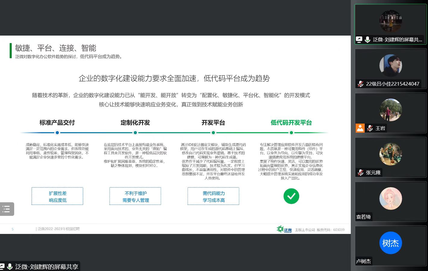 本次直播共分为企业宣讲和线上答疑两个环节。在企业宣讲环节中,泛微网络公司招聘者刘建辉分别从企业的发展历程、产品研发创新、资质荣誉、公司客户伙伴等方面进行细致的介绍与讲解。在线上答疑环节中,同学们积极提出自己的就业疑惑难题,嘉宾就公司的实习机会、薪酬待遇及未来发展趋势等方面耐心做出解答,激发学生求职意愿,现场互动氛围十分热烈。活动最后,王岩提醒同学们要树立“先择业,再就业”的观念,珍惜把握眼前的就业机会,同时祝愿毕业生们能找到自己心仪的工作。