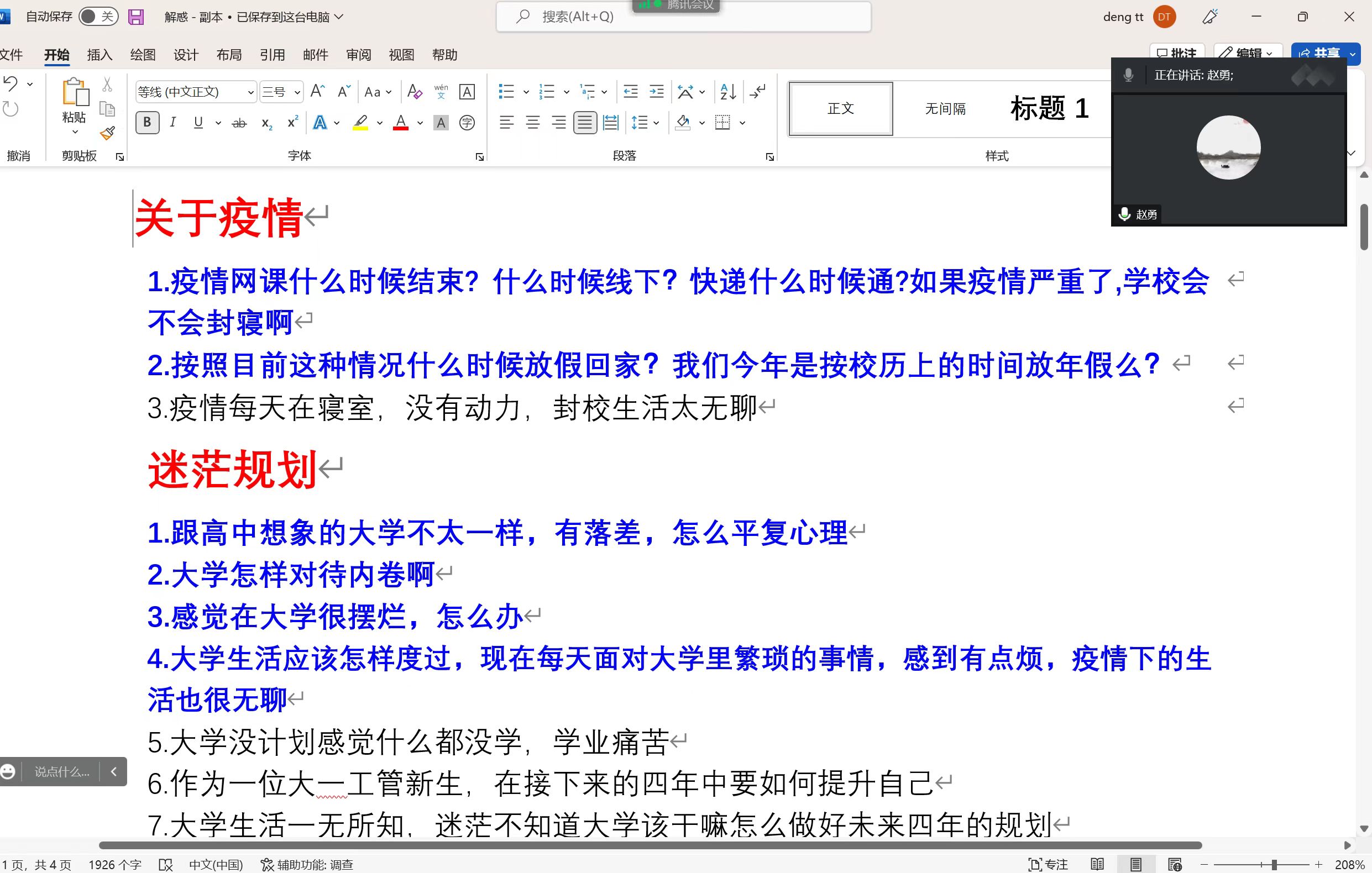 答疑会伊始,赵勇询问了学生的日常生活和近期感受,以示关心,并对会议内容做简要介绍。2022级工商管理类专业团支书王栖桐展示学院教师高厚宾、王博、冯冬等提出的专业课程学习建议,以及优秀的高年级学生代表给出的学习生活建议,解答了同学们的疑惑。赵勇耐心解答学生在生活、学习、情感等方面的问题,并对同学们的学习规划进行指导。会议期间,师生敞开心扉,互动交流,分享学习生活经验。最后,赵勇对本次会议进行总结,解释学校防疫政策,安抚学生不安情绪,传达出学院对同学们的关心、鼓励和重视。