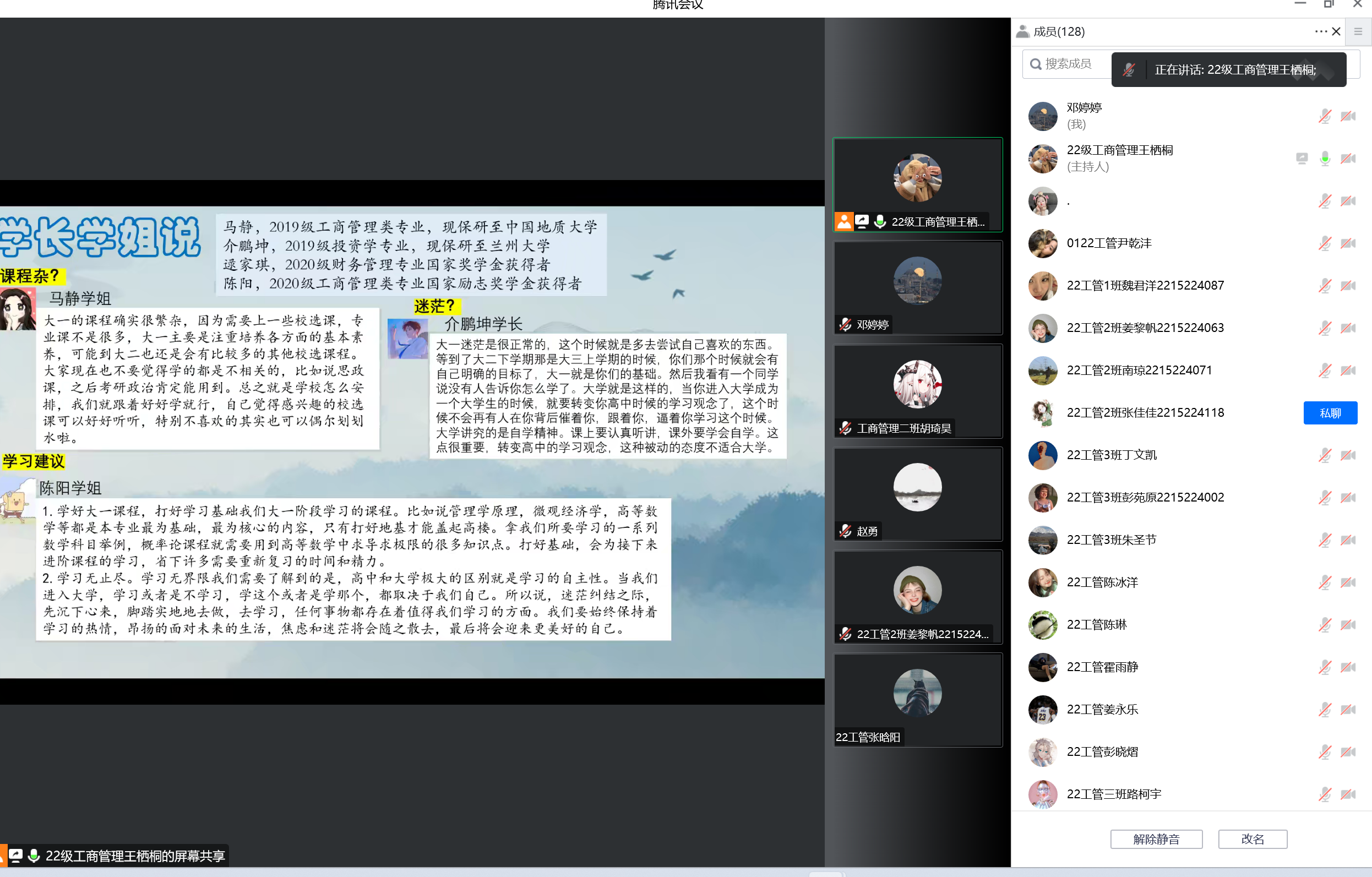 为了解学生疫情防控状态下的学习生活状况,切实解答同学们的学业问题,进一步指导专业学生做好大学规划,11月5日晚,商学院2022级工商管理类专业举办“辅导学业,静等疫散”线上的答疑会,班主任赵勇及全体学生参加了本次会议。