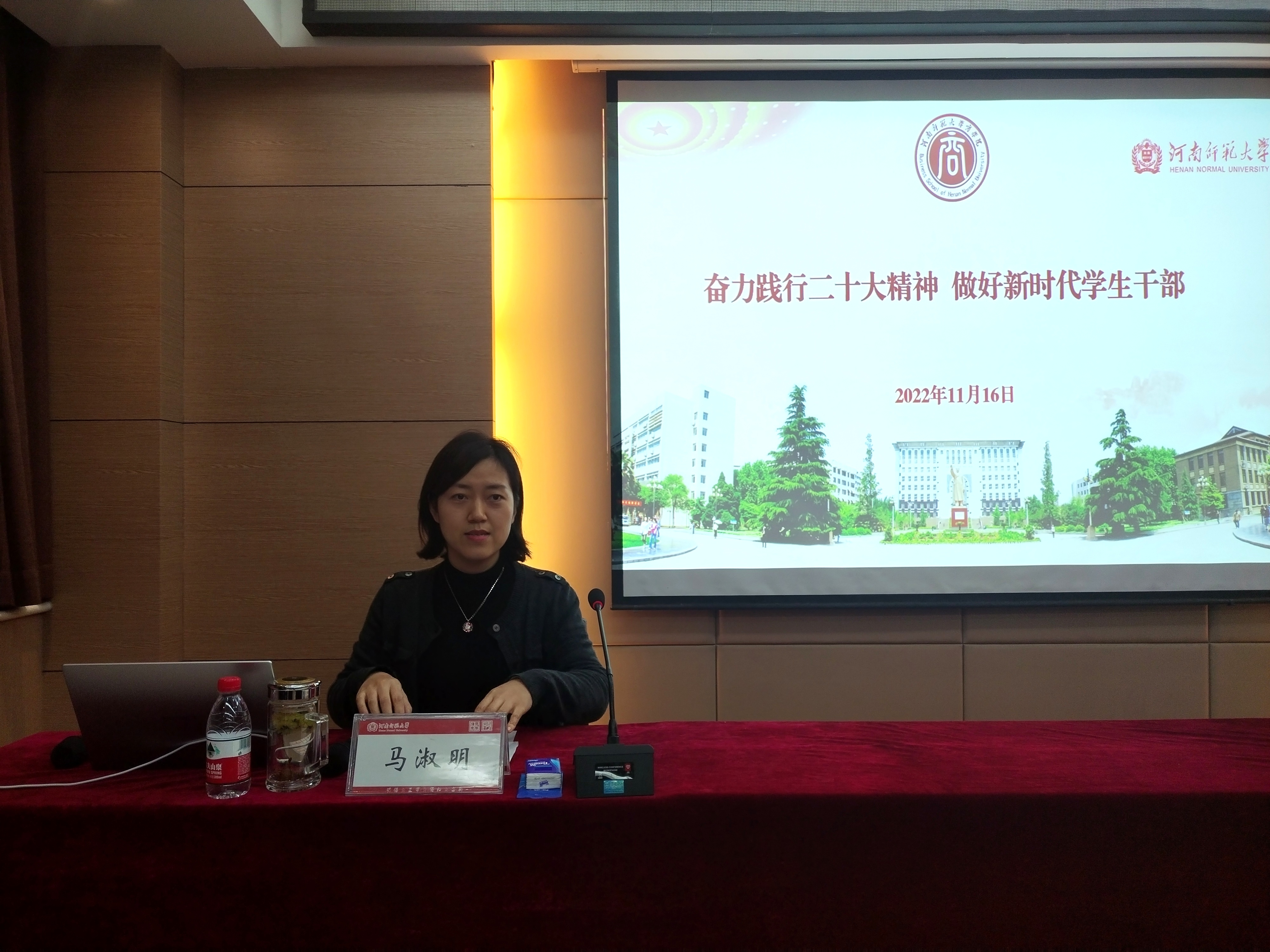 为提升新生干部思想素质,发挥团学骨干积极引领作用,引导学生树立榜样责任意识,11月16日晚,商学院于学院119报告厅举行“奋力践行二十大精神,做好新时代学生干部”主题讲座。本次讲座由商学院党委副书记马淑明主讲,2022级全体学生干部参加。