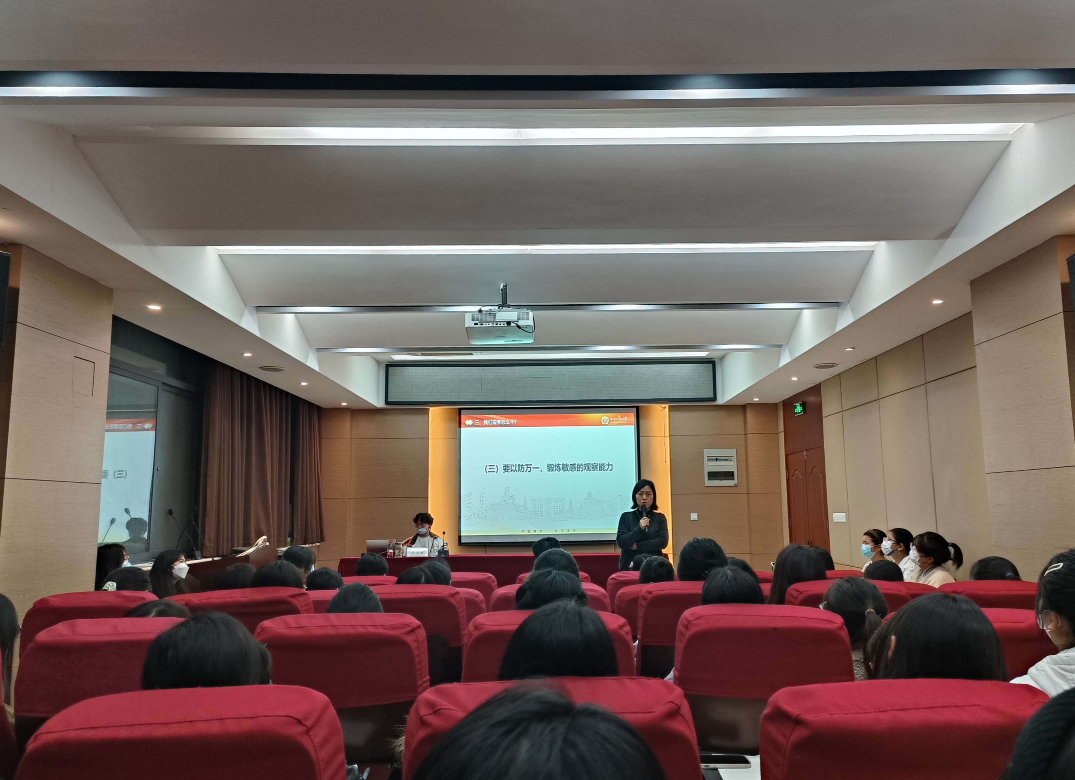 讲座中,马淑明以“我们的角色是什么”“我们需要干什么”“我们需要怎么干”三个问题为导向,由浅入深,详细解读如何做好一名新时代学生干部。她谈到,学生干部应该充分认识并理解“大学”“团学骨干”的深层含义,要做到身份定位,明确职责,正确处理学习与工作的关系,协助老师,服务同学,锻炼自我。马淑明指出学生干部必须秉承服务意识,发挥好学院、老师与学生之间连接的纽带作用,同时,她强调团学骨干应该坚守“四个一”原则:一要表里如一,保持过硬的思想定力,坚定理想信念;二要知行合一,培养卓越的学习能力,夯实专业课程基础;三要以防万一,锻炼敏锐的观察能力,注重加强防范意识;四要百里挑一,提升竞争能力,认真细致,严格要求自己。