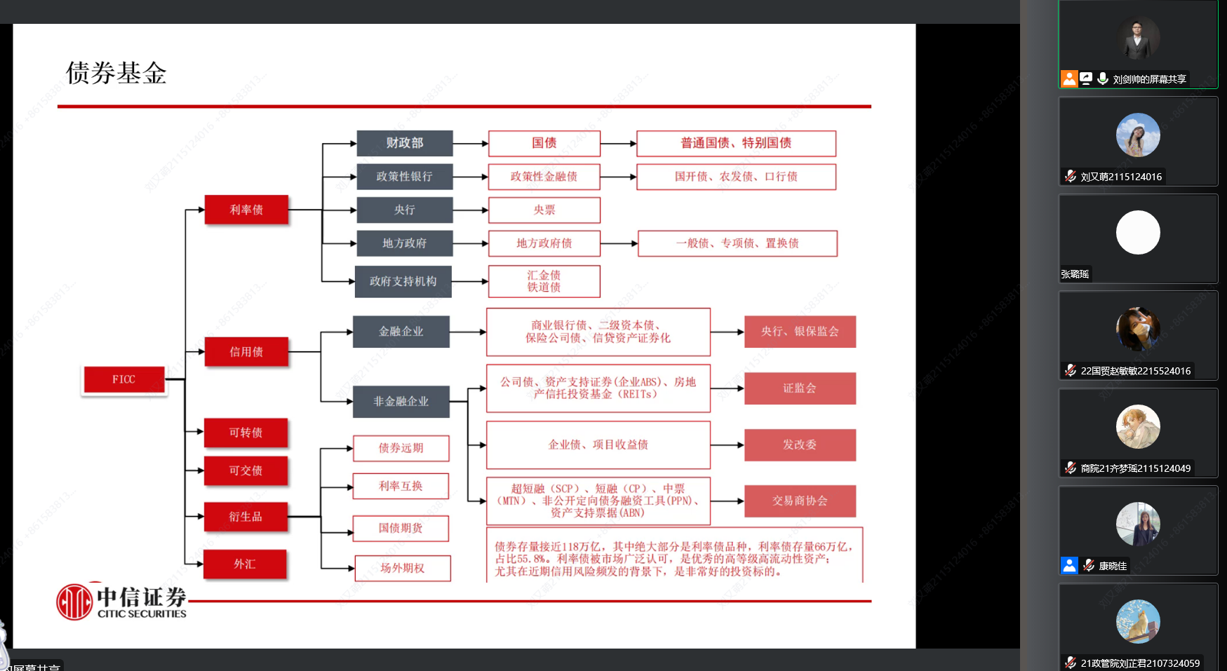 为帮助同学们了解企业发展状况、学习资本市场知识,增强学生理论知识的运用能力,2022年11月26日,商学院经济贸易协会举办“资本市场初体验——资产配置ABC:基金入门的那点事儿”讲座,由中信证券公司从业人员刘剑帅讲授相关知识,五百余名学生线上参会。
