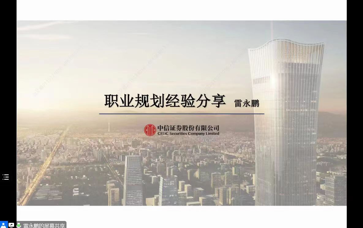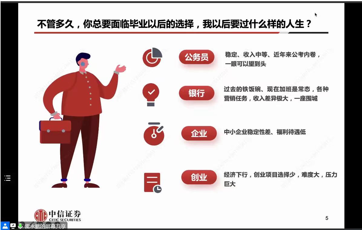本次活动分为“职业经验知识分享”和“在线答疑”两个环节。“职业经验分享”环节中,雷永鹏以“毕业后能干什么”引入话题,分别从“什么样的工作才叫好工作”“我要成长为一个怎样的人”及“进入中信证券,我得到了什么”三个板块讲授,告知同学们要具备“有能力、有素质、爱学习”等多项品质,鼓励学生成为积极向上、受人尊敬、实现理想抱负的人。他以自身为例详细介绍了证券公司的就业现状及相关行业知识,以“仰望星空,脚踏实地,莫问前路,水到渠成”为寄语,期盼同学们能够描绘好自己的人生蓝图,做好职业规划。“在线答疑”环节中,同学们积极发言,主讲人针对学生提出的问题提出个人见解与意见,活动氛围热烈,学生受益匪浅。