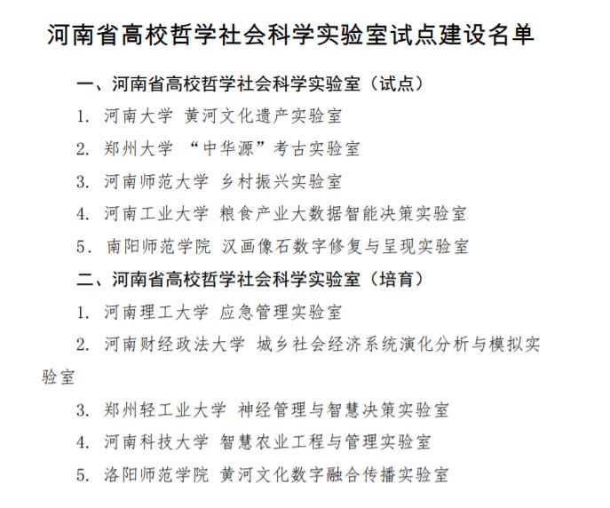 近日,《中共河南省委教育工委河南省教育厅关于公布河南省高校哲学社会科学实验室试点建设名单的通知》文件正式发布,河南省高校哲学社会科学实验室首批支持建设5个试点实验室、5个培育实验室,依托商学院建设的“乡村振兴实验室”获得首批试点实验室建设支持。