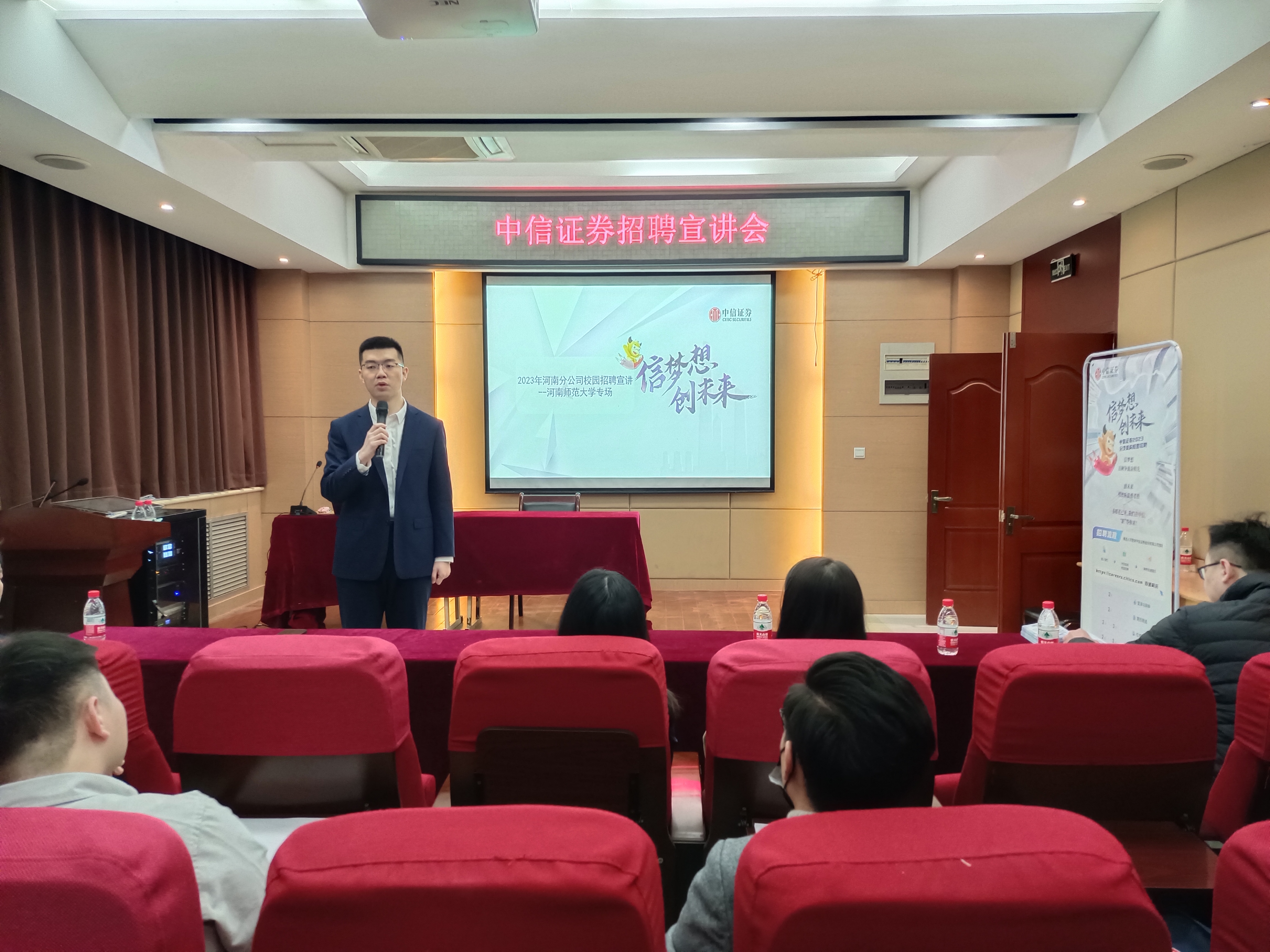 中信证券股份有限公司是中国证监会核准的第一批综合类证券公司之一,是中国第一家A+H股上市的证券公司,业务范围涵盖证券、基金、期货、直接投资等多个领域,在金融行业中保持领先地位。宣讲会上,中信证券公司新乡营业部执行总经理雷永鹏为学生播放企业宣传片,就公司经营模式及理念、招聘岗位、福利待遇等进行讲解,让同学们对企业有更直观地了解。此外,中信证券公司从业人员李雪分享自己的工作经历,介绍公司良好的薪酬待遇、优质的工作团队、完善的福利保障等。在问题交流环节,公司负责人耐心回答同学们提出的有关简历投递、招聘要求等问题,打消应聘生疑虑,有效扩宽了校企合作间的信息桥梁,现场氛围十分活跃。宣讲结束后,商学院党委副书记马淑明对宣讲内容进行总结,鼓励学生踊跃参加相关招聘活动,为人生发展挖掘机遇,创造有利条件。团委书记王岩肯定了宣讲会对毕业生就业及企业招新的积极作用,对学生提出殷切期待。