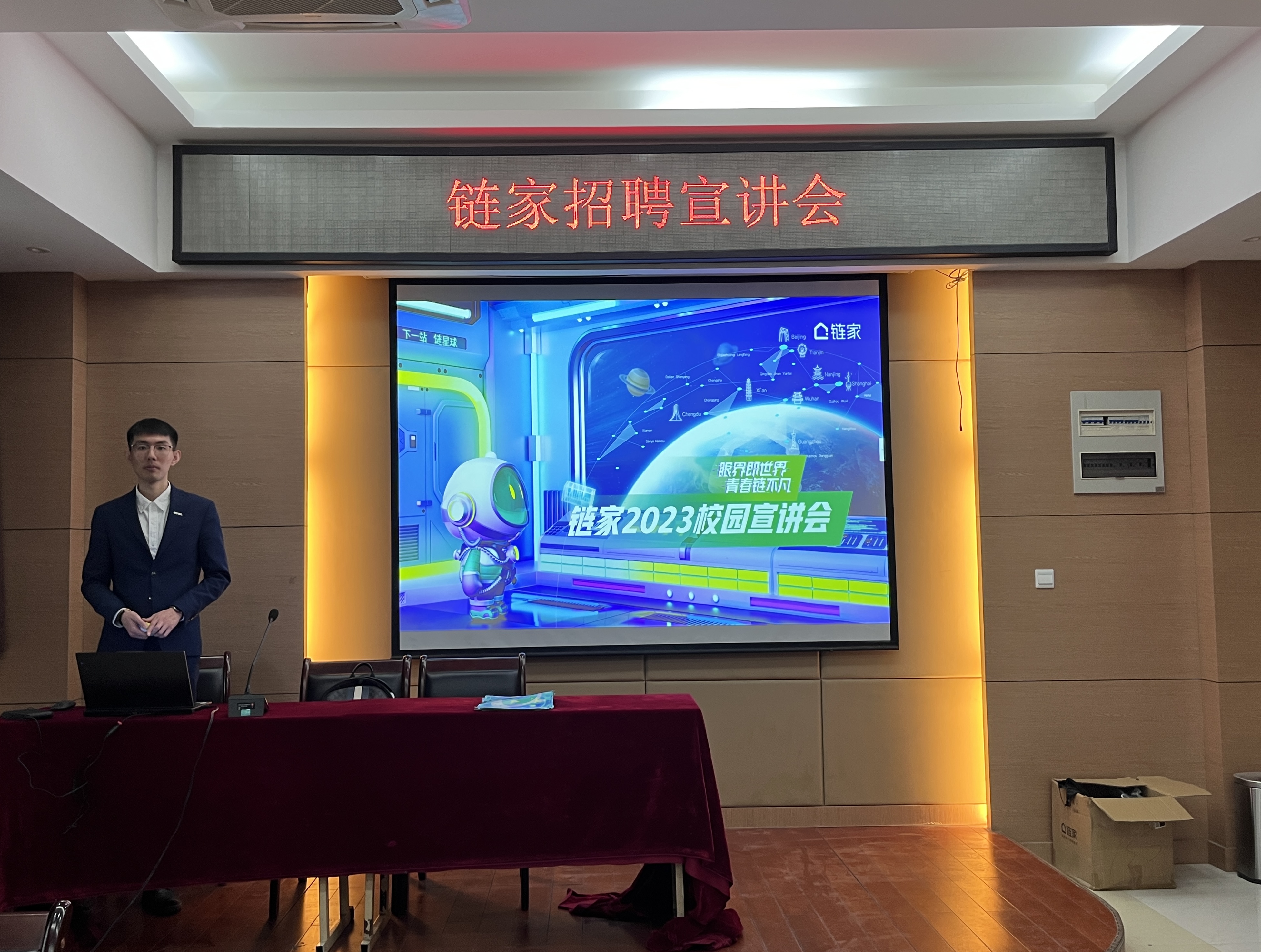 链家房地产经纪有限公司属世界五百强企业,在美国纽约证券交易所和中国香港证券交易所双上市,是中国房产服务业的国民品牌,业务范围涵盖房屋交易、租赁、整装等领域。链家总部校园部经理刘鹏飞担任此次宣讲会主讲人,为同学们详细介绍招聘岗位及工作性质。宣讲过程中,刘鹏飞就链家的经营理念、企业文化、招聘岗位、薪酬待遇、福利保障制度、员工培养体系等展开讲解,帮助同学们更加深入直观地了解公司情况及工作内容。问题交流环节中,参会学生积极提问,刘鹏飞对同学们的问题进行细致耐心地解答。答疑环节结束后链家公司对有意向应聘岗位的同学进行面试并现场签约。