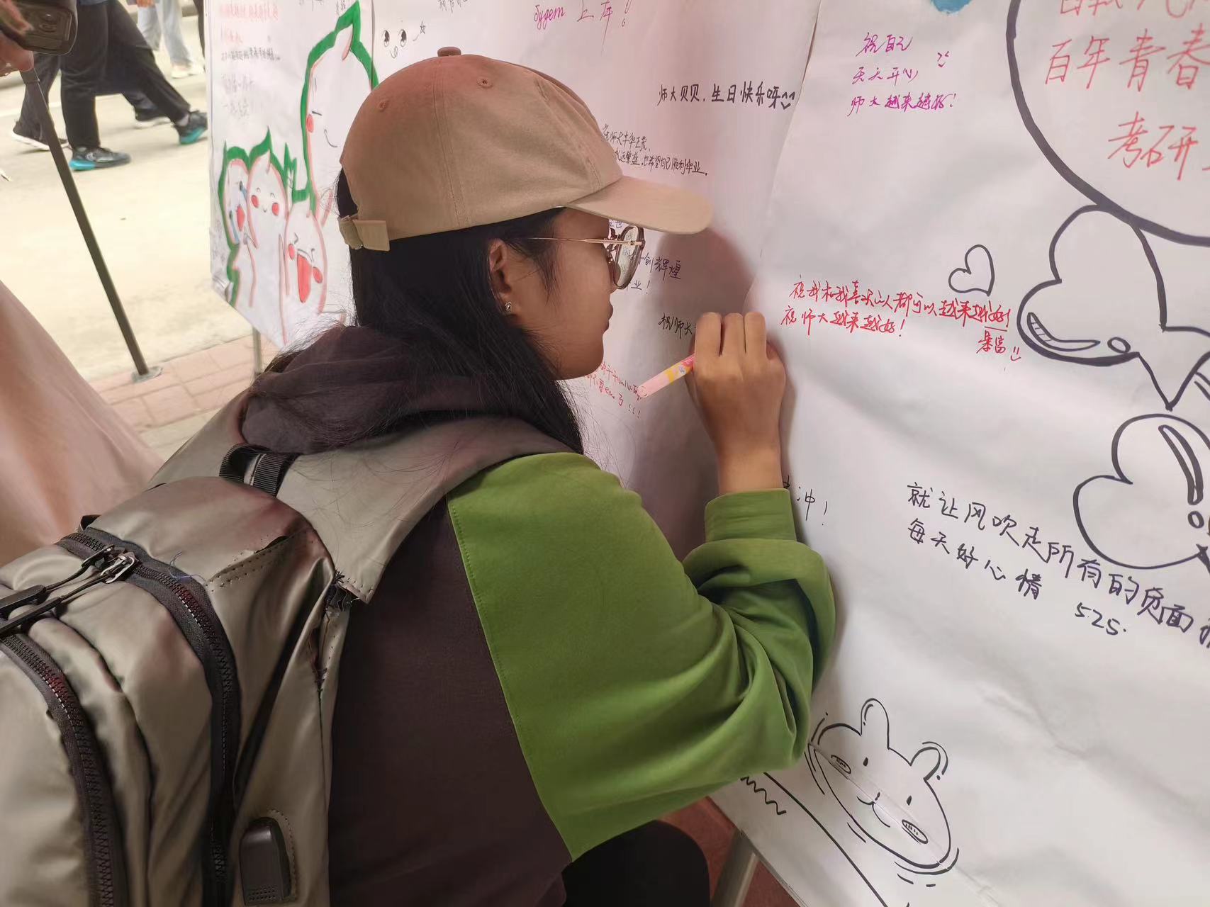 本次活动由展板活动和便签活动两部分组成。活动前期,学院精心策划、细致筹备,借助微信推文、QQ通知等多种方式加大宣传力度,及时传达活动信息,认真做好预热工作。在展板活动中,同学们在展板上或是诉说近期心理情绪,或是寄托未来美好期望,或是表达对师大百年校庆祝福,字字流露真情,句句饱含深情;在便签活动中,大家以文传心,以画述情,在便签上分享喜悦与烦恼,绘出真实细腻想法,写下未来美好祝愿。同学们积极参与,乐在其中,现场氛围十分活跃。活动结束后,学院学生纷纷表示,此次活动有助于缓解学习生活焦虑,提高自身心理素质,坚定勇敢面对挫折信念,以昂扬之姿迎接挑战。