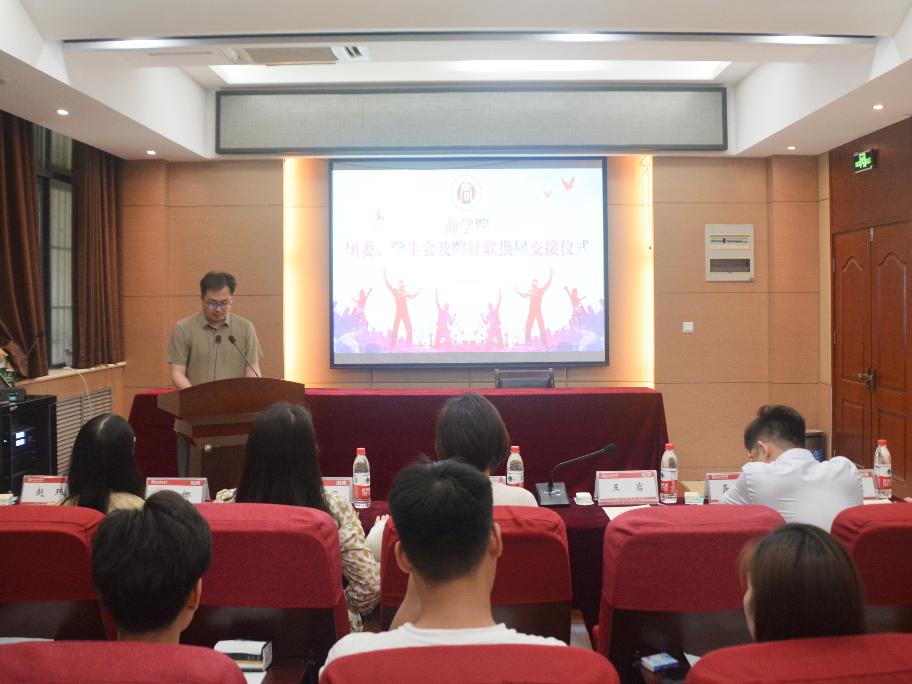 为确保学院学生工作连贯性,增强学生会凝聚力与向心力,6月2日中午,商学院于学院119报告厅举办第二十三届团委、学生会及院社联换届交接仪式。商学院党委副书记马淑明,团委书记王岩,各年级辅导员,第二十二届主席团成员、各部部长及第二十三届学生会全体成员参加仪式。