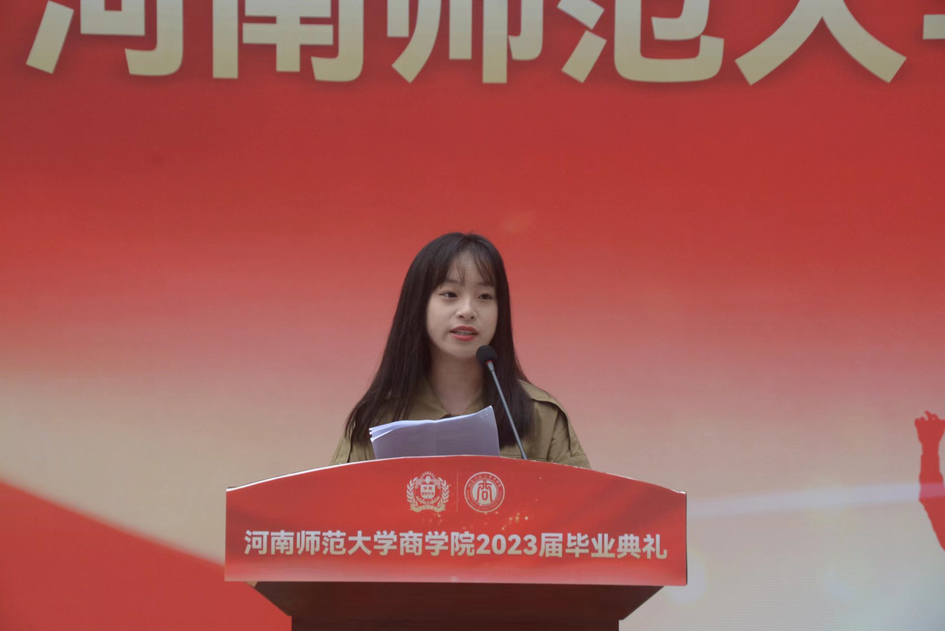 随后,学院毕业生代表依次发言。研究生代表牛依蕾感恩母校、学院老师对她的关心和帮助,表示将会脚踏实地,牢记“博学经世,商善天下”的院训,并希望学院蓬勃发展、再书华章;本科生毕业生代表郭丽丽回顾四年历程,表示将牢记初心使命,担当时代责任,在各行各业彰显青年使命与担当;专升本毕业生代表史亚龙感恩学院的精心栽培及悉心照料,表示将珍重青春韶光,牢记期盼教诲,勇敢面对挑战。