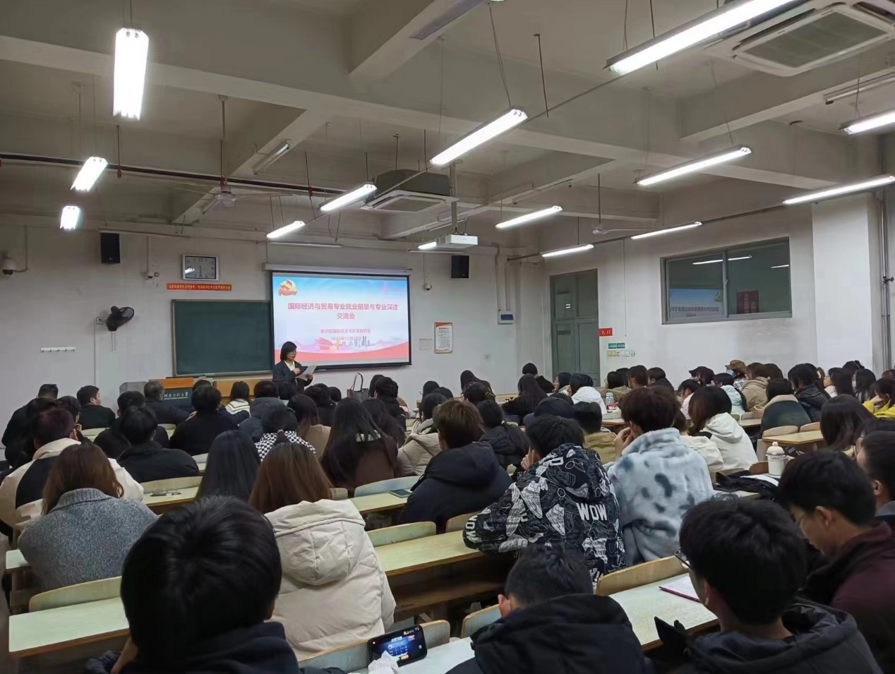 为提升国际经济与贸易专业学生的认知水平,明晰发展方向,助力个人规划,2023年11月28日晚,2021级、2022级和2023级国际经济与贸易班于求实西楼101教室召开就业前景与专业深造交流会。河南邦尼生物工程有限公司跨境运营主管陈学乾、河南河一工刀具有限公司董丽方及国际经济与贸易教研室丁祥生等教师参会。本次交流会由国际经济与贸易教研室主任侯明利主持。