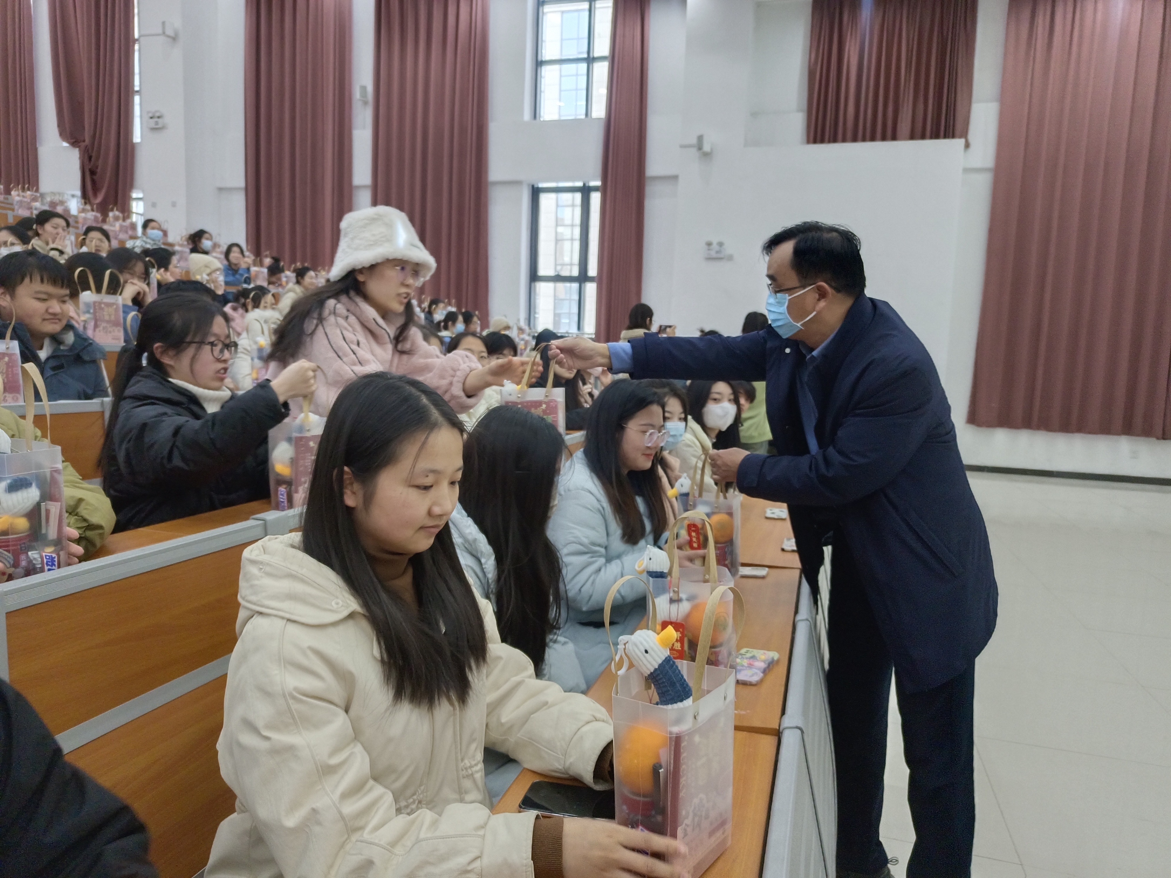 亲切的交流,温馨的祝福,寓意满满的考研福袋,代表学院对考研学子最真挚的祝愿和最美好的期许。慰问现场,刘英基充分肯定同学们坚守初心、勤学不怠的精神风貌,鼓励学生做到“战略上藐视,战术上重视”,在学习上注意查漏补缺,找准学习方法和技巧,充分利用好课本知识和考试真题等重要复习资料;在生活中调节情绪,通过体育锻炼缓解压力,提高身体素质,以平稳的心态和健康的身体冲刺备考。随后,2020级辅导员赵玮提醒学生夯实基础知识、保持专注状态,充分利用资源,坚定奋斗的目标和必胜的决心,并预祝考研学子执笔为剑,金榜题名。最后,学院领导为考研学子发放暖心“考研慰问礼包”:考研“旺旺”、加油冲“鸭”、“士力架”倍、心想事“橙”、金“棒”题名,寓意深刻,温情护航。一句关怀暖心间,一份祝福载厚望。同学们纷纷表达感谢,表示“取之于师大,回馈于师大。我们将合理规划时间,保持昂扬的斗志,相信在剩下时间里,我们定会实现考研梦,不负青春,无愧恩师。”