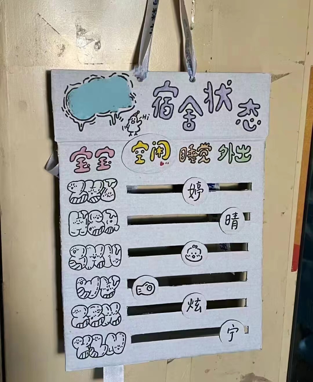 本次活动以宿舍单位,宿舍全体成员积极参与。其中,在设计门牌的过程中,同学们紧紧围绕活动主题,充分发挥想象力,运用绘画、手工、涂鸦、剪纸等方式进行创作,同学们互相帮助,相互配合,在宿舍门牌制作的同时,收获快乐和友谊。古有亭台楼阁,今有宿舍小窝,各式各样的门牌充分展示出多姿多彩的寝室风采,一块门牌,记录一段时光;一行文字,撰写宿舍生活;一间宿舍,见证舍友之间的情谊,展现出同学们对美好寝室生活的向往。同时,部分宿舍以废旧纸盒纸袋等物品为原材料,给宿舍增添一抹亮丽的同时也充分体现出同学们废物利用、绿色环保的理念。活动结束后,2023级工商管理专业袁浩天感慨道:“通过制作宿舍门牌,我不仅学到很多关于设计和创意的知识,还体验到团队合作带来的力量与乐趣。我相信,这次经历将会成为我大学生活中难忘的一部分。”