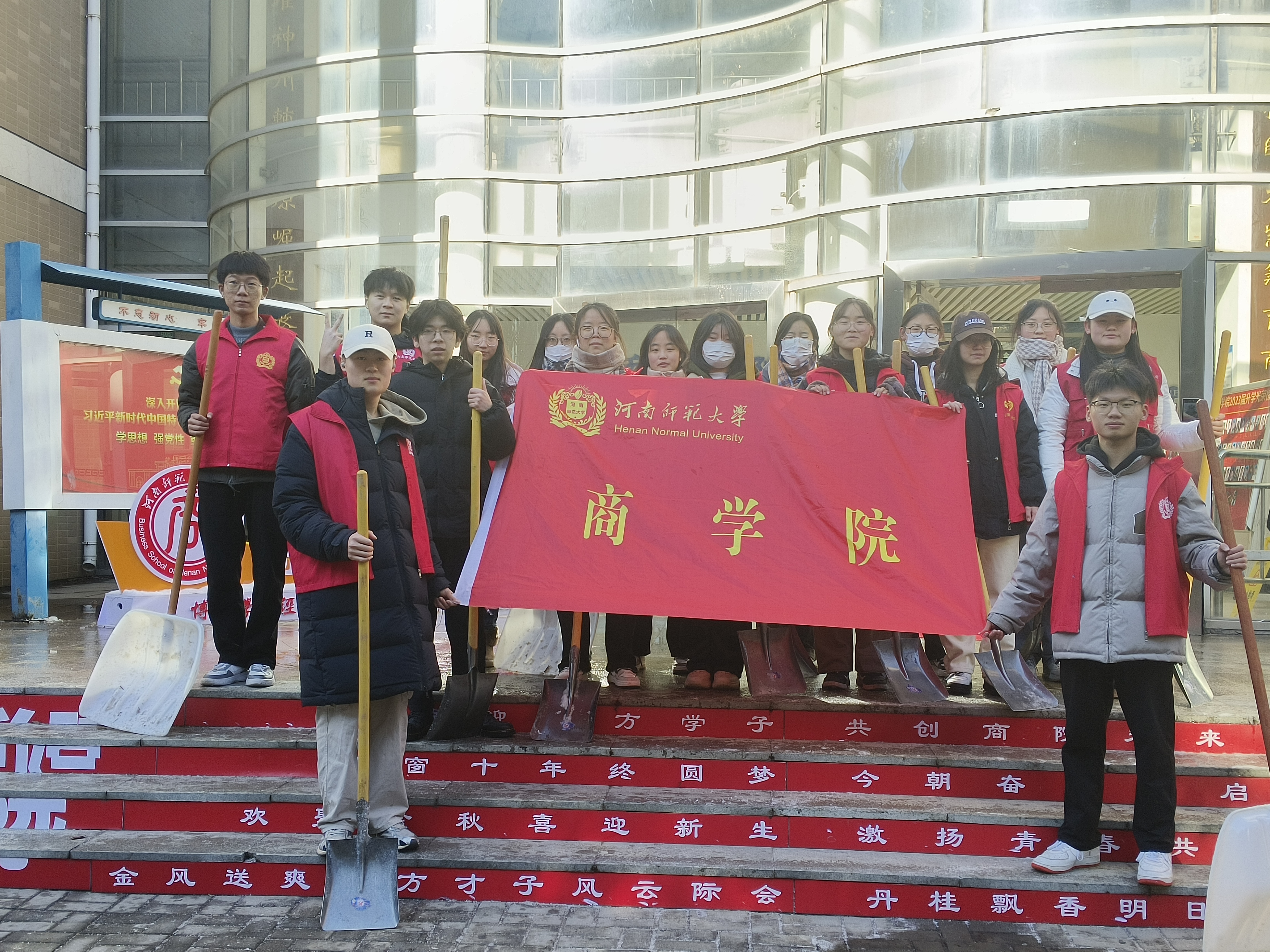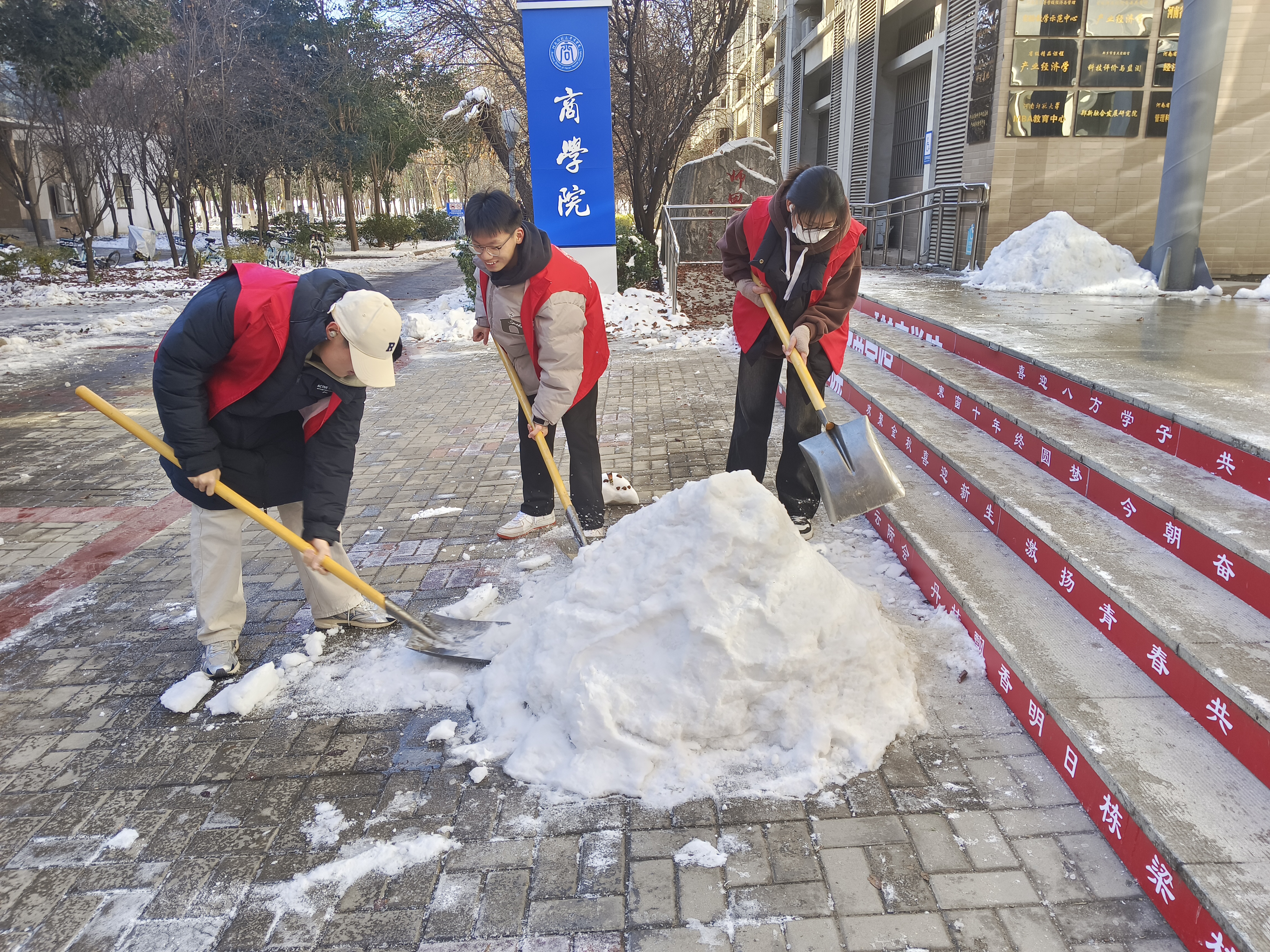 同学们自发组成的志愿者队伍于商学院楼前集合,由学院学生会执行主席闫嘉乐同学进行分组并明确分工,讨论清雪方式,领取扫雪工具,做好充分准备工作。大家配合默契,铲雪、扫雪与破冰工作有条不紊地进行。寒冬料峭,在凌冽的北风中,同学们不畏严寒、干劲十足,挥动着铁锹、扫把,“以雪为令、闻雪而动、迎雪而上”,对各自负责路段和区域内的积雪和冰层进行清扫铲除,全身心投入扫雪工作。铁锹与冰层的碰撞,忙碌且认真的身影,一派热火朝天的景象,仿佛簇簇燃烧的火苗,温暖着学院师生的冬天,成了皑皑白雪中最靓丽的风景。经过近一个下午的奋战,学院楼内外的积雪被清扫得干干净净,为师生开辟了一条充满温情的通畅之路、平安之路。