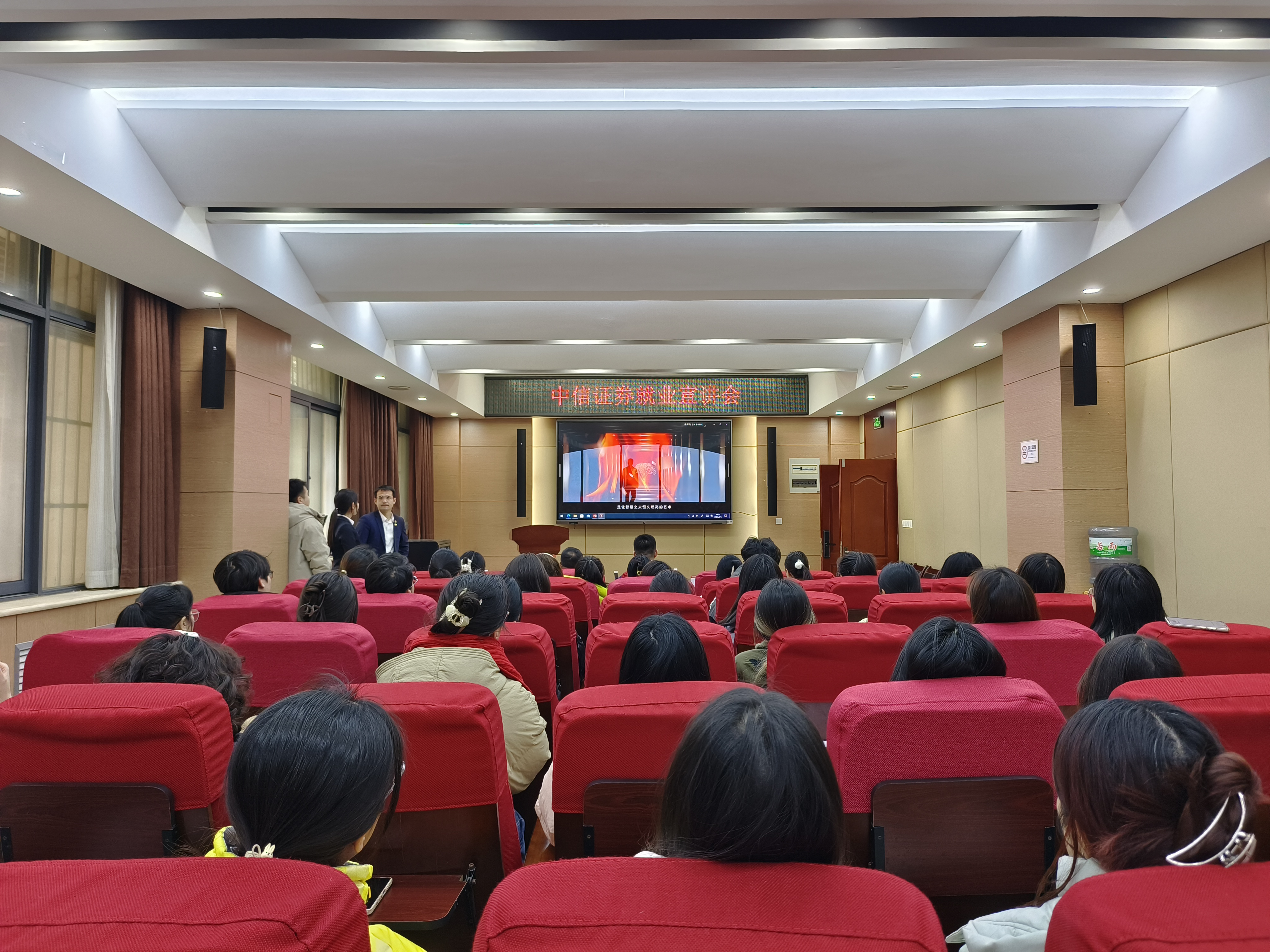 为深化院企对接与合作,促进毕业生高质量就业,帮助学生精准把握就业方向,3月5日下午,商学院邀请中信证券公司于学院119报告厅开展招聘宣讲会,学院党委副书记马淑明、2020级辅导员赵玮及2024届本硕毕业生参加本次宣讲。会议由2020级辅导员赵玮主持。