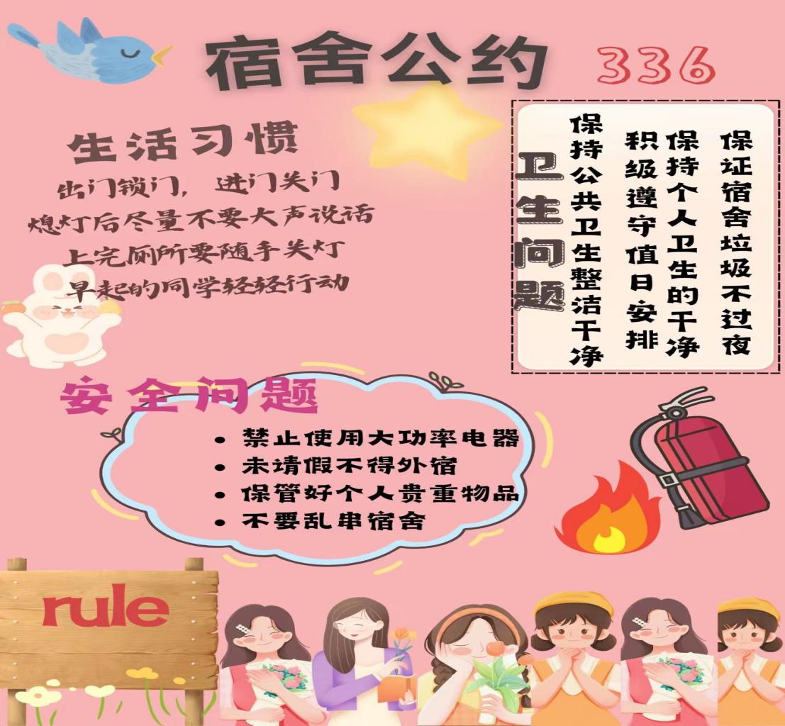 在本次活动中,同学们以宿舍为单位,围绕宿舍公约、宿舍安全等相关主题,团结协作,默契配合,充分发挥想象力和创造力,制作出带有自身寝室特色的海报作品。一句句言语主题深刻、意蕴丰富;一个个图案构思新奇、构图巧妙;一张张海报制作精湛、画面优美,展现出独特的寝室文化,彰显出互助互爱、积极愉悦的寝室氛围。在作品评选环节中,评委们秉持公平公正原则,最终评选出一批优秀海报作品。其中,336寝室的作品画面精致漂亮,宿舍成员卡通形象可爱灵动,并紧扣主题,从生活习惯、卫生问题、安全问题三个方面出发,阐明了寝室公约,构思精巧,图文并茂,在一众海报作品中脱颖而出。307寝室别出心裁,通过引用每位寝室成员的“名言”,配以清新雅致的画面风格,勾勒出温馨美好的寝室生活图景,传达出昂扬向上的寝室精神面貌。