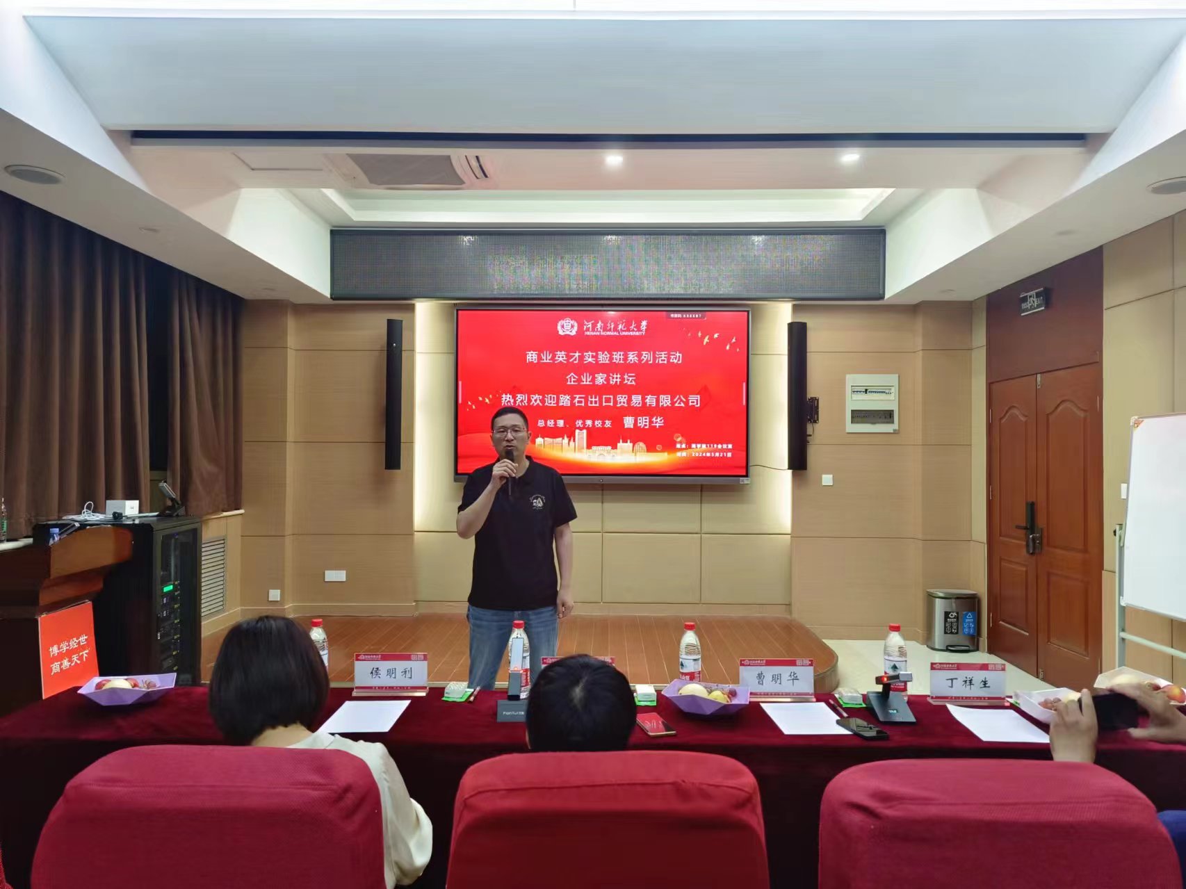 为进一步深化产教融合,帮助同学们深入认识专业知识和社会职场,5月21日晚,商学院于学院119报告厅召开就业前景与专业深造企业家讲谈会。本次会议由国际经济与贸易教研室主任侯明利主持,由踏石出口贸易有限公司总经理曹明华担任主讲,2022级部分学生代表参加。