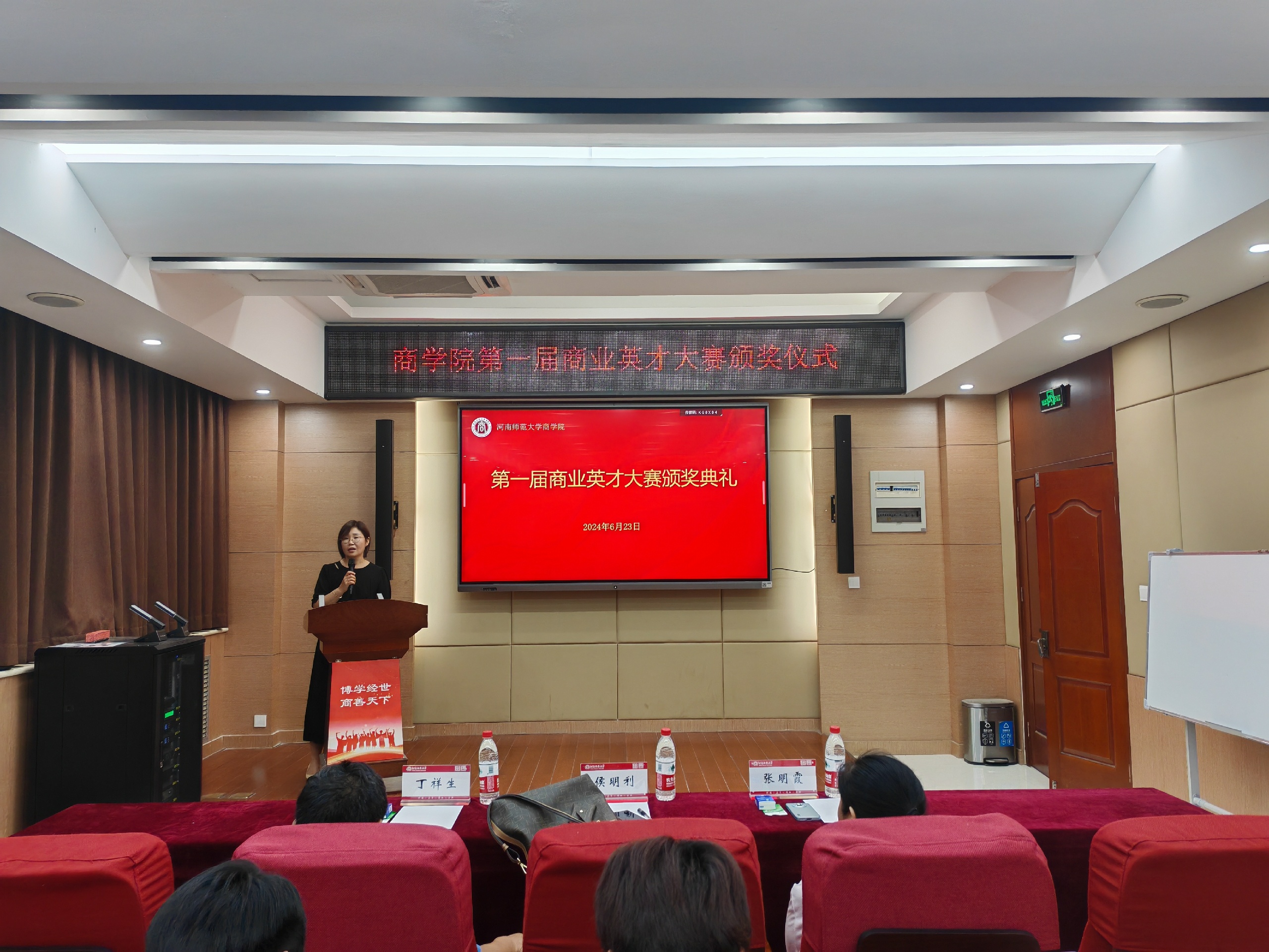 近日,第一届“邦尼杯”商业英才大赛圆满落幕。为巩固大赛成果,及时进行表彰奖励和经验总结,进一步加强学生商业素质教育,6月23日晚,商学院于学院119报告厅举行第一届“邦尼杯”商业英才大赛颁奖典礼。大赛指导教师侯明利、张明霞、丁祥生及商学院部分学生参加仪式。