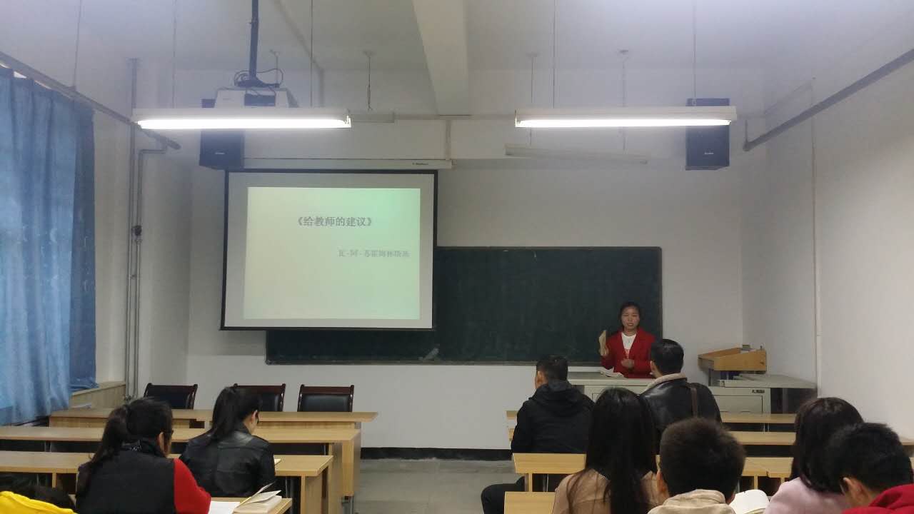 方梦婕给我们分享的经典书目是《给教师的建议》,她从作者简介,主要内容和个人感悟三方面介绍了这本书。这本书内容非常充实,有一百条给老师的建议,全面地反映了作者的教育思想和教育实践。这一百条建议,每一条都谈了一个问题,既有生动的实际事例,又有精辟的理论分析。文字深入浅出,通顺流畅,是本教育经典书,很多都是苏霍姆林斯基教育教学中的事例,在我们以后的教学中都可以借鉴。