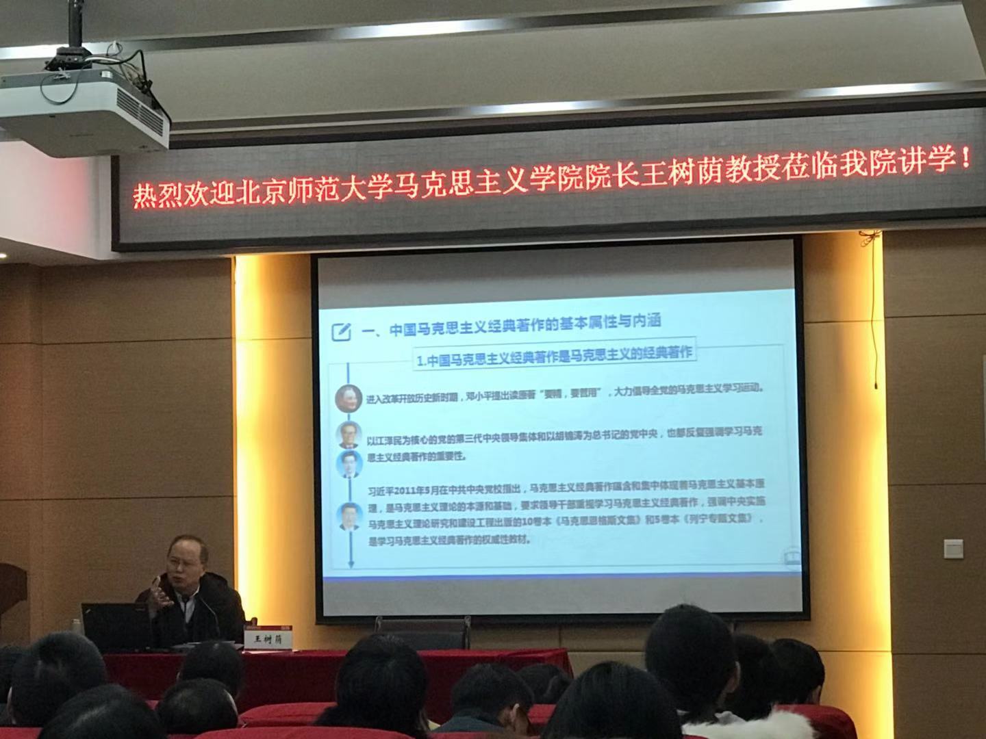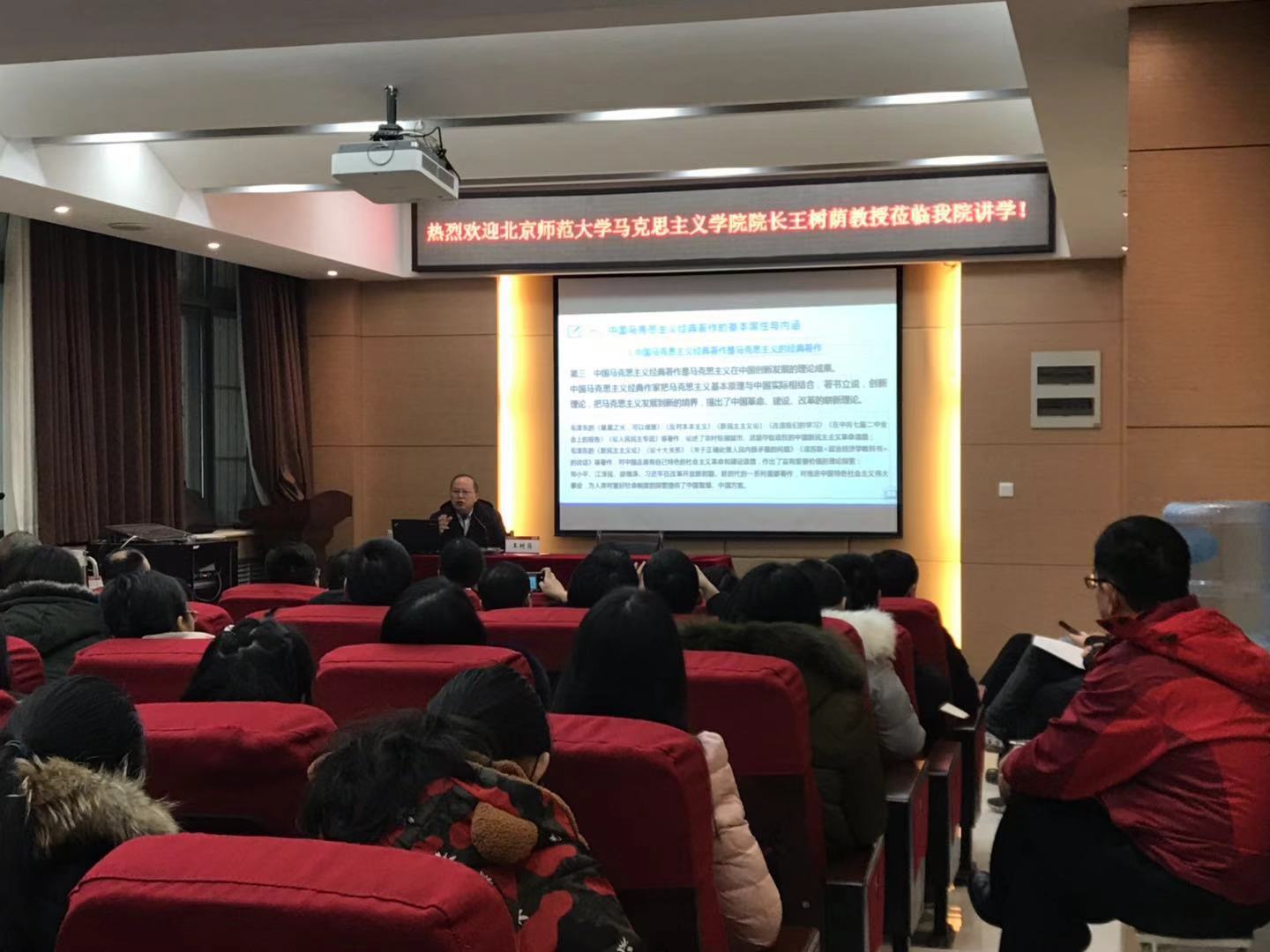 2019年1月7日下午,北京师范大学马克思主义学院院长、教授、博士生导师王树荫教授莅临我校讲学。本场讲座是第三届马克思主义牧野论坛的第四讲,讲座在商学院119会议室举行。马克思主义学院师生100余人聆听了本次讲座。本次讲座由马克思主义学院院长马福运主持。