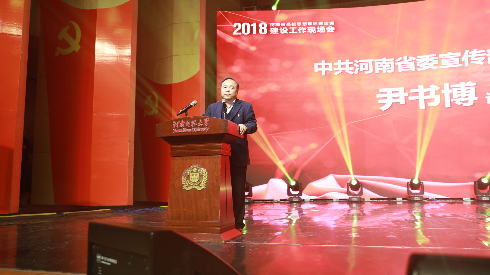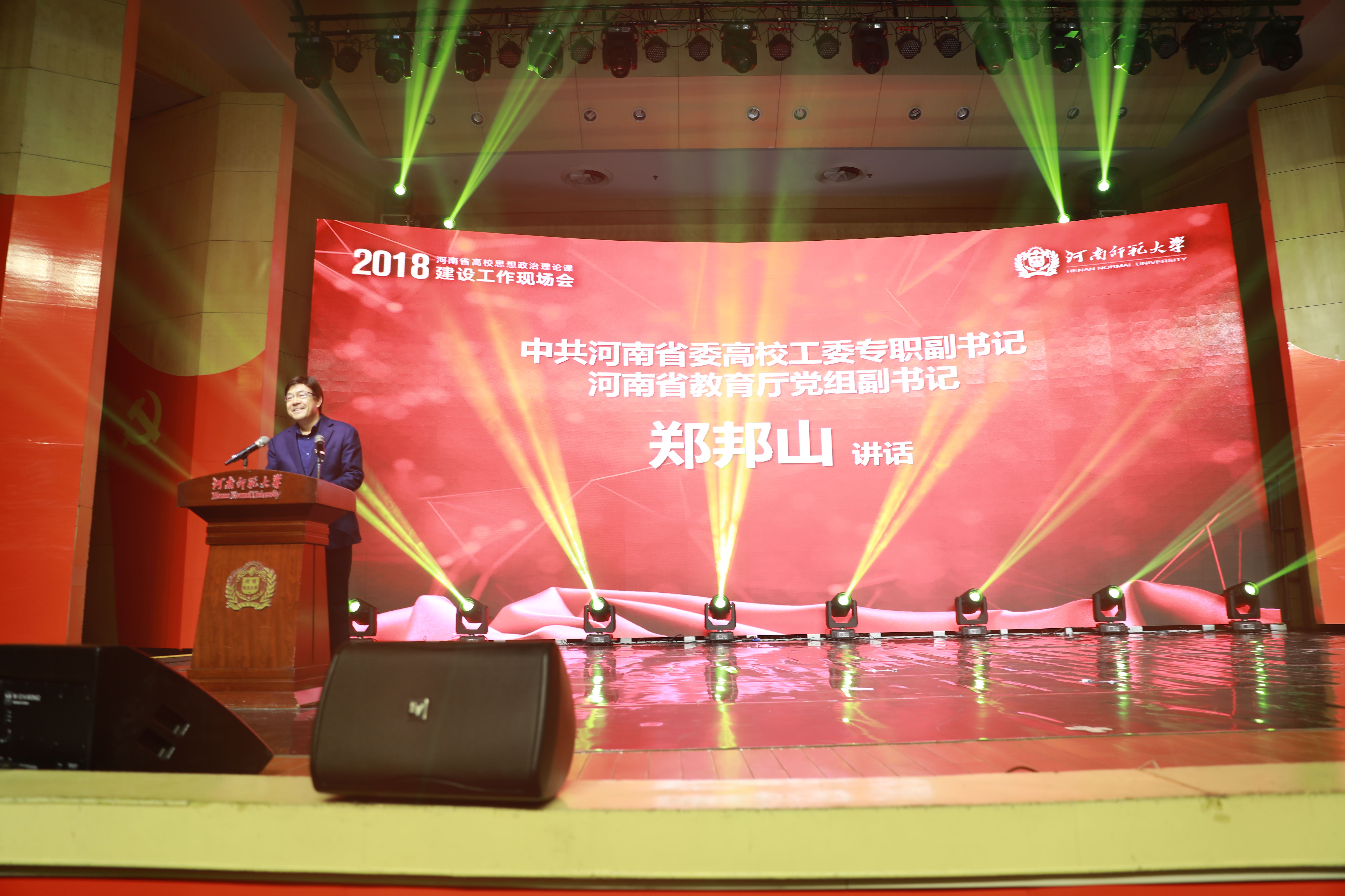 11月11日下午,2018年度河南省高校思想政治理论课建设工作现场会在我校举行,教育部社会科学司司长刘贵芹,河南省委宣传部副部长尹书博,省委高校工委专职副书记、省教育厅党组副书记郑邦山,河南省高校思想政治理论课教学指导委员会主任委员、郑州轻工业学院党委书记俞海洛,省教育厅思政处处长李培俊出席会议导。河南省各高校主管思想政治理论课建设的校领导、马克思主义学院院长、思想政治理论课教学部主任、2018年度全省思想政治理论课教学技能大赛决赛的参赛选手、各高校观摩教师及媒体代表参加了本次现场会。