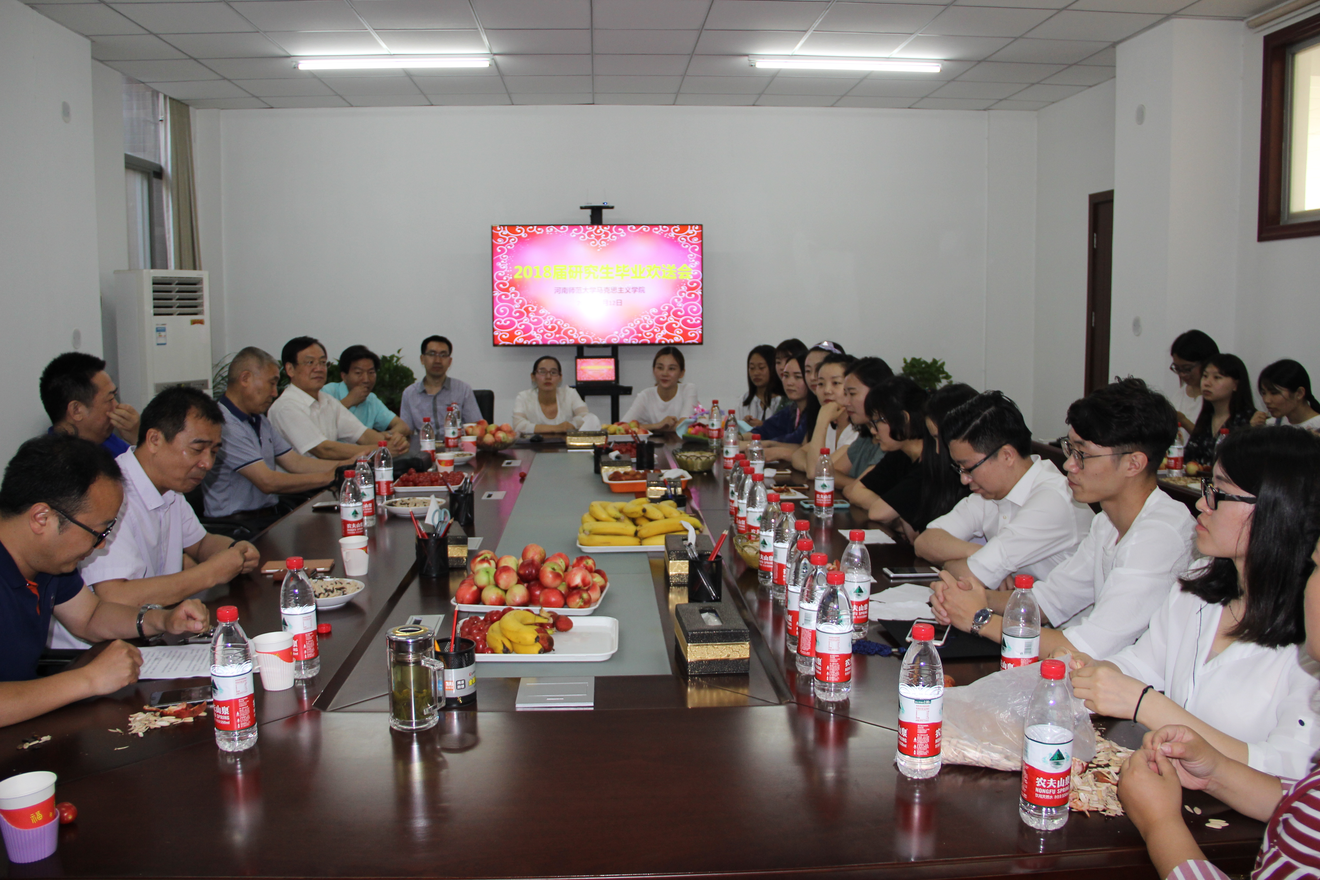 欢送会上,学院领导、研究生导师与毕业生们进行了互动交流,老师们对全体毕业生圆满完成学业表示祝贺,对在校期间为学院所做的贡献表示衷心感谢,同时对即将踏出校门的毕业生们提出了殷切希望,希望同学们在未来的人生道路上,继续努力,展现河南师大马克思主义学院学子的良好风貌。各位与会2018届研究生也纷纷畅所欲言,表达对学院、对老师们的感激与不舍之情,回忆在校期间的点点滴滴,憧憬未来大展拳脚的宏图大志,大家纷纷表示,一定会始终坚持“精育良才、教育报国”的师大初心,大力弘扬“崇文明道、尚诚守德、抱朴求真”的师大精神,牢记时代使命,做勇于担当的师大人。