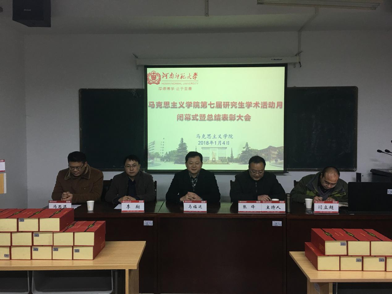 2018年1月4日晚,马克思主义学院研究生学术活动月闭幕式暨总结表彰大会在第二会议室召开,院长马福运老师、副院长李翔老师、研究生工作秘书闫立超老师和辅导员冯思淇老师出席。2016级和2017级全体研究生参加了本次会议。本次闭幕式由张锋书记主持。