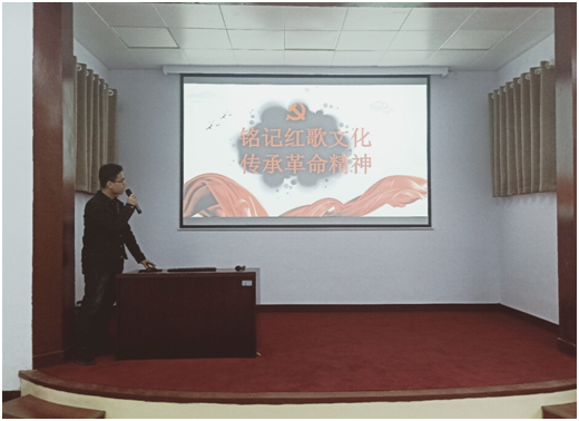 活动伊始由三位学生代表分享他们对于红歌的认识与感悟。其中张永洁、李万宇从红歌的由来及其现实意义、红歌的发展现状和红歌的传承与发展三方面出发,带领同学们对红歌进行更深层次的了解,使同学们认识到了传承红色文化的重要意义。李宗蓄同学以“铭记红歌文化,传承革命精神”为主题,从红歌的由来及特点、传承红歌的重要性以及如何传承红歌等方面为切入点,激励同学们铭记红色文化。主题宣讲结束后,全体同学起立共唱中国共青团团歌。最后辅导员牛昱斐鼓励大家,要认真汲取红歌背后所蕴含的深刻内涵,立志高远要传承好历史,讲述好历史,把“红歌”精神传承发扬好 ,立足当下要结合自身专业实际,将传承革命精神和专业有效契合。激情澎湃的团歌激励着与会同学积极参与到红色文化的传承中,在实践中深化对革命精神的理解。
