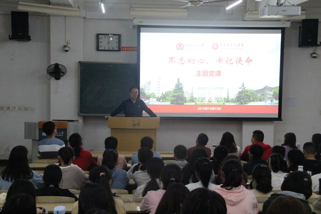 为深入推进“不忘初心、牢记使命”主题教育活动,进一步加强对大学生的思想引导,增强党员党性观念,10月13日,马克思主义学院学生党支部及部分学生代表于东区教学楼203举办“不忘初心、牢记使命”主题党课。本次主题党课由院党总支副书记张锋主讲,全体专兼职辅导员、研究生及 2018级、2019级本科生参加。