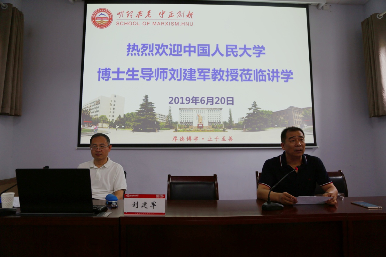 2019620日,中国人民大学马克思主义学院博士生导师刘建军教授应邀来我院讲学。讲座在平原楼108会议室举行,马克思主义学院师生一百余人聆听讲座。本次讲座由马克思主义学院党总支书记蒋占峰教授主持。