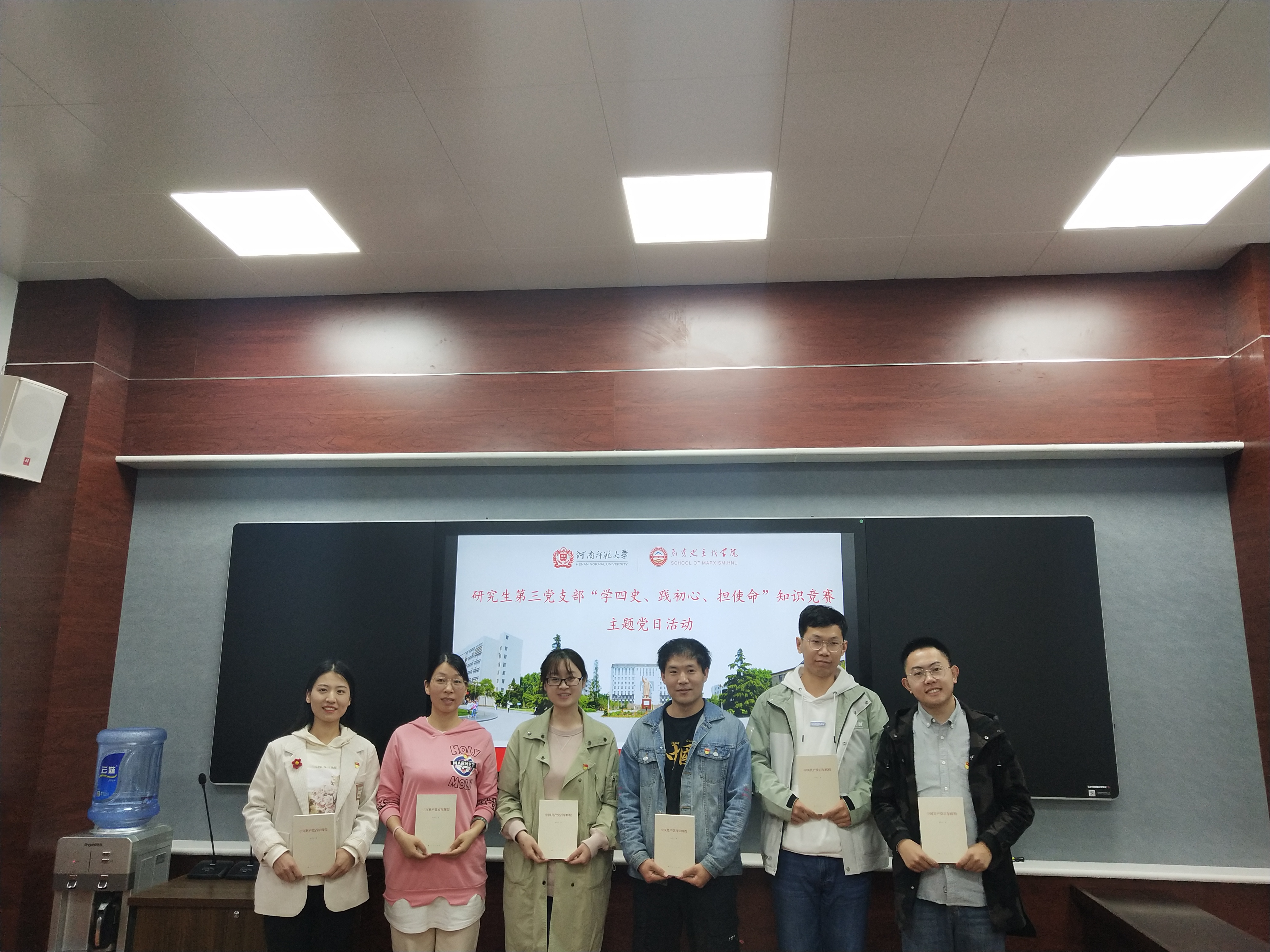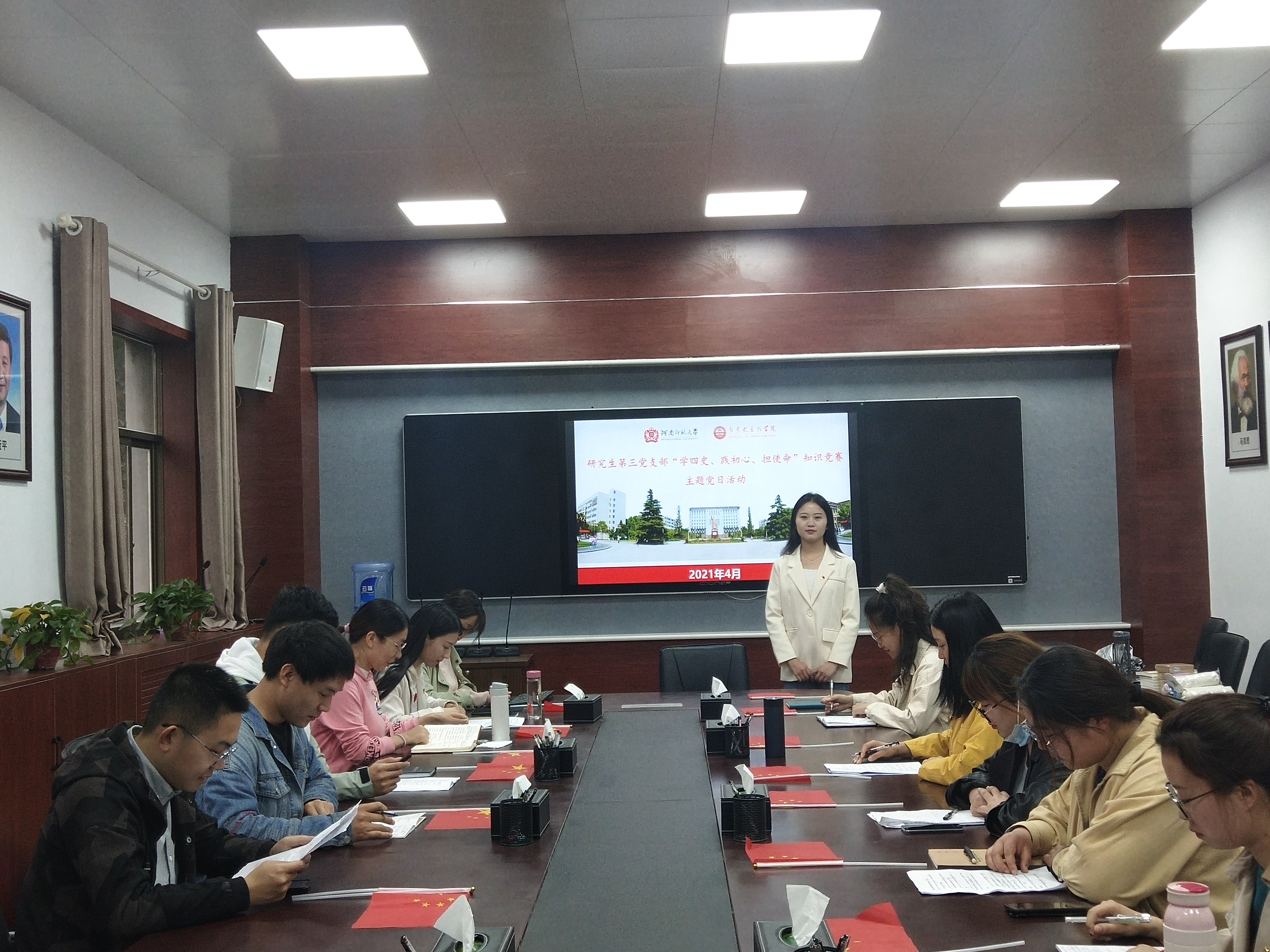 为深入学习贯彻习近平总书记关于学习“四史”重要论述,引导学生党员知史爱党、知史爱国,进一步深化支部成员对“四史”的认识,在新时代继承红色基因,研究生第三党支部于4月20日下午在平原楼201会议室开展“学四史、践初心、担使命”知识竞赛主题党日活动。会议由支部书记毕兰雪主持,支部全体党员参加。