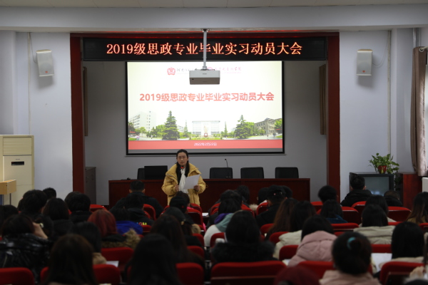 2月22日下午,2019级思想政治教育专业毕业实习动员大会在平原楼108会议室召开。副院长曲嘉、思想政治教育系主任王一平、教师代表陶利江、冯思淇、范彬、尹蕾及2019级思想政治教育专业全体学生参加会议。