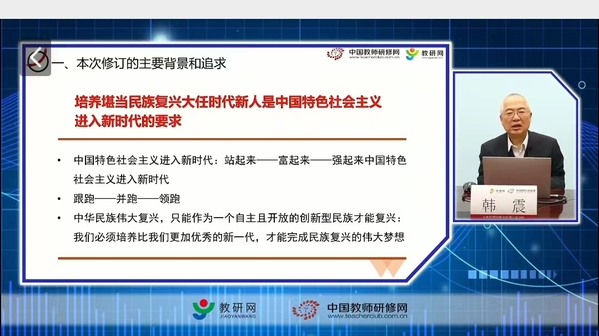 韩震教授首先分析了本次课标修订的国内外背景,阐释了当代培养堪当民族复兴大任时代新人的追求。随后,他从六个部分详细解读了义务教育道德与法治课程标准(2022年版)的主要变化与突破。紧接着,针对课程性质与概念、实施中的重难点问题阐述了自己的观点,为大家指点迷津。最后,韩教授提醒教材编写应做到“一个坚持”“五个体现”,要加强教师的研究与培训。