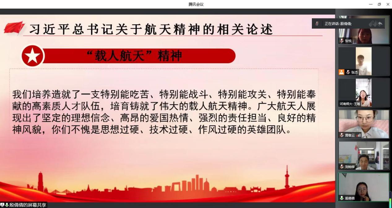 活动伊始,主讲人殷倩倩带领支部党员学习了“两弹一星”精神、探月精神等航天精神,回顾了我国航天事业发展史,从东方红卫星跃然于世到天舟二号飞向太空,从登月时代开启到天宫号空间站的建立,中华民族的飞天梦在众多科学家脚踏实地的努力中正一步步变为现实,党员们深刻感受到这不仅仅是一部新中国航空航天发展史,更是我们伟大的党百年发展奋斗史的缩影。其中,赵杰同志表示,有志者事竟成,我国载人航天工程起步晚、基础弱,但在这样的困境下,一代又一代的航天人迎难而上,用汗水和泪水铸造中国的飞天梦想,作为青年党员,我们也应该将个人志向与党的事业、民族未来相结合,始终坚定理想信念,勇往直前,朝着梦想阔步前行。