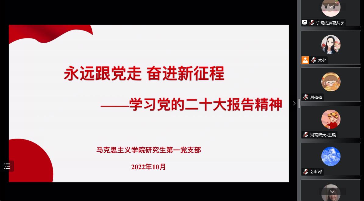 2022年10月16日至10月22日,中国共产党第二十次全国代表大会于北京召开。为深入学习贯彻党的二十大精神,激发广大党员坚定理想信念,践行初心使命,10月25日下午,马克思主义学院研究生第一党支部在线上开展“永远跟党走 奋进新征程”主题党日活动,支部全体党员参加了此次活动。