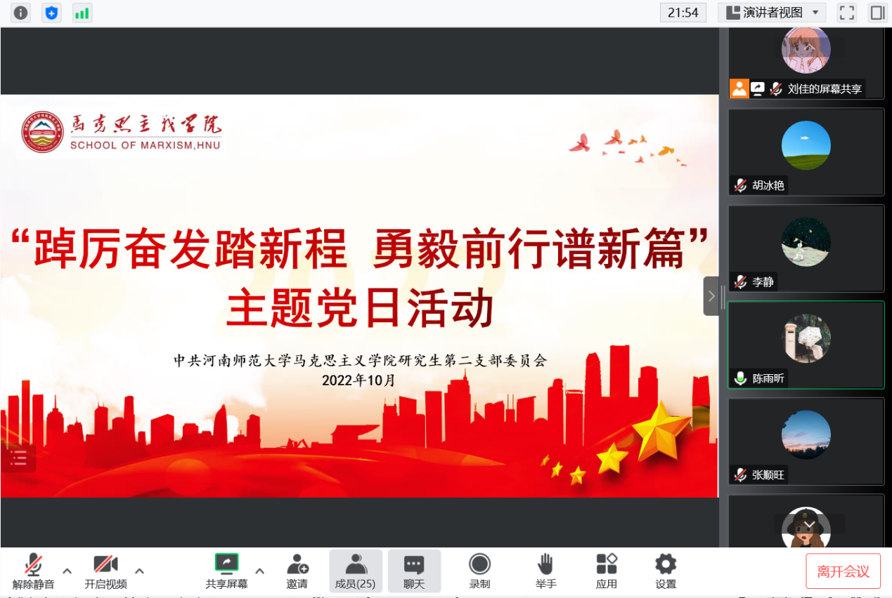 2022年10月16日,中国共产党第二十次全国代表大会开幕会在北京人民大会堂胜利召开,习近平总书记代表第十九届中央委员会向党的二十大作报告。党的二十大是在全党全国各族人民迈上全面建设社会主义现代化国家新征程、向第二个百年奋斗目标进军的关键时刻召开的一次十分重要的大会。近日,为深入学习党的二十大精神,马克思主义学院研究生第二党支部以线上的形式开展了以“踔厉奋发踏新程 勇毅前行谱新篇”为主题的党日活动。