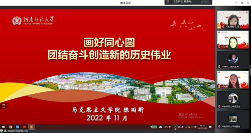 陈雨昕以《画好同心圆,团结奋斗创造新的历史伟业》为题,围绕“深刻领悟团结奋斗的时代要求、准确把握团结奋斗的内在逻辑、广泛凝聚团结奋斗的精神共识、奋力书写团结奋斗的美好未来”四个方面展开宣讲。宣讲中,陈雨昕从历史的角度出发,引用大量马克思主义经典著作以及中华优秀传统文化的内容,向参会成员讲述党的百年奋斗历程,并运用大量史料讲述众多名人事迹来增强同学们对中华优秀传统文化、党史以及重大历史成就的了解,讲解深入浅出又通俗易懂,极大吸引了同学们的兴趣。两位主讲人宣讲之后,王瑶对两位宣讲员的本次宣讲做了简单总结,并号召大家要认真学习党的二十大精神,要立志做有理想、敢担当、能吃苦、肯奋斗的新时代好青年,让青春在全面建设社会主义现代化国家的火热实践中绽放绚丽之花。