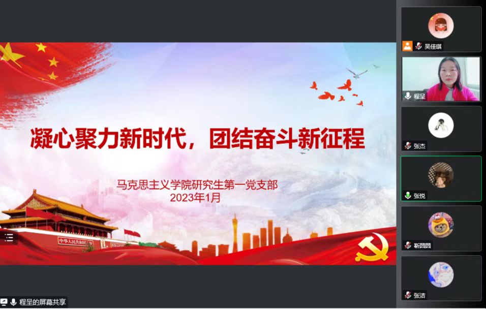 为进一步坚定支部党员的奋斗意志,弘扬奋斗精神,练就奋斗本领,马克思主义学院研究生第一党支部于1月12日下午在线上召开“凝心聚力新时代,团结奋斗新征程”主题党日活动,支部全体党员参与其中。