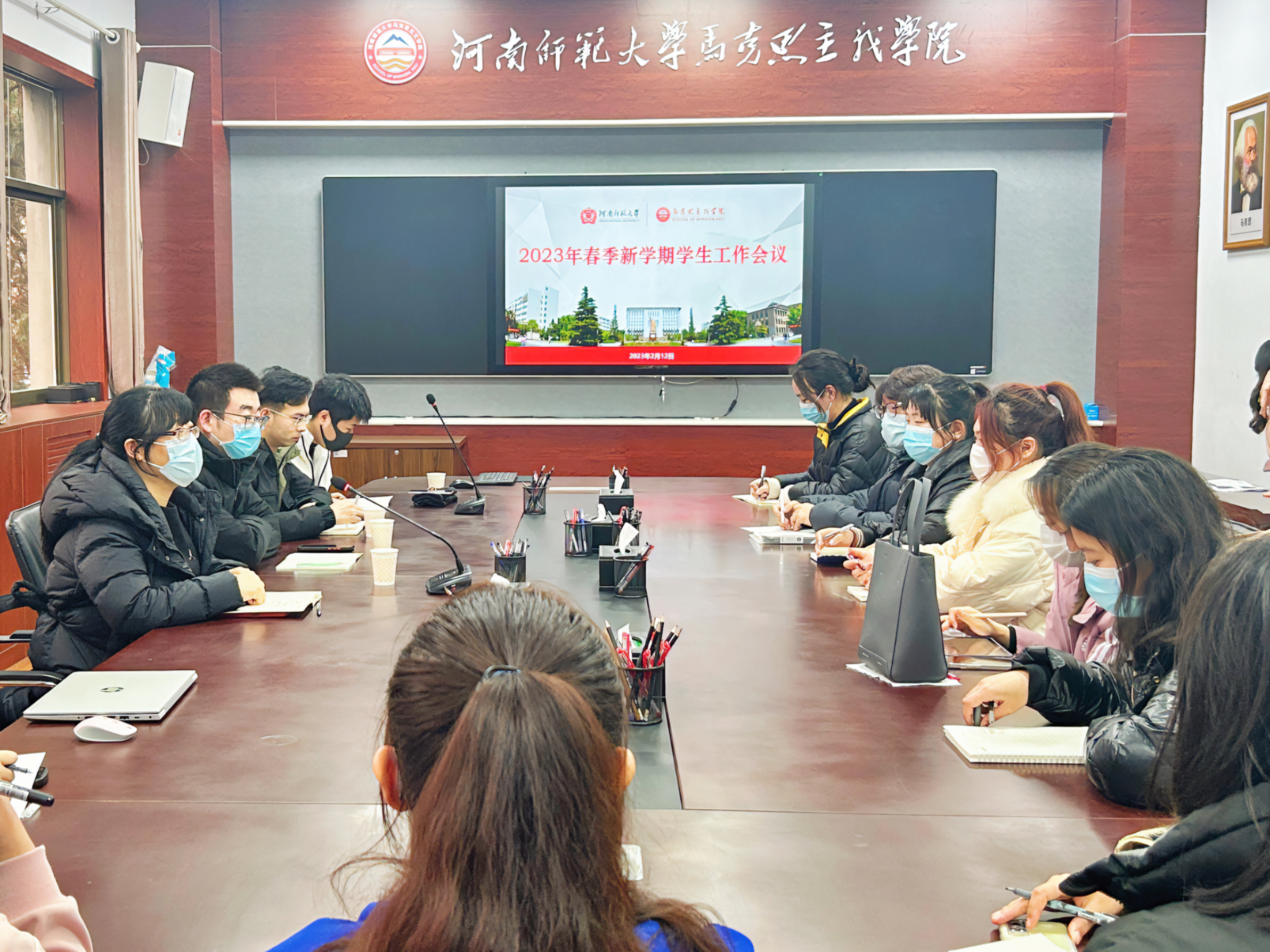 为更好地做好新学期工作,推动学生工作提质增效,2023年2月12日下午,马克思主义学院在平原楼201召开新学期学生工作会。马克思主义学院党委副书记王秀杰、各年级辅导员、各年级班委代表及第五届学生会主席团成员参加座谈会。