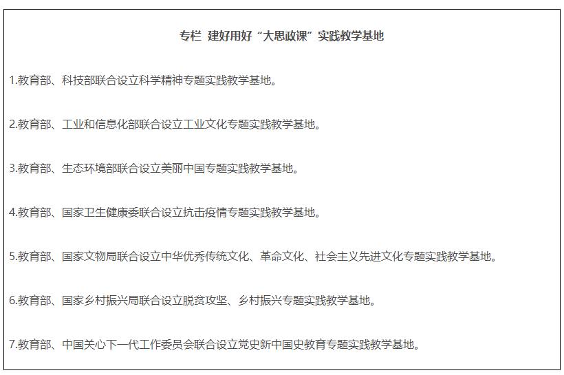 10.建好用好实践教学基地。教育部会同有关部门,利用现有基地(场馆),分专题设立一批“大思政课”实践教学基地。发挥好教育部高校思政课教师研学基地的实践教学功能。各地教育部门要结合实际,积极建设“大思政课”实践教学基地。大中小学要主动对接各级各类实践教学基地,开发现场教学专题,开展实践教学。有条件的学校可与有关基地建立长效合作机制,加强研究和资源开发。各基地要积极创造条件,与各地教育部门、学校建立有效工作机制,协同完成好实践教学任务。