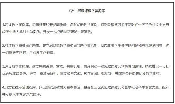 19.全面推进课程思政高质量建设。教育部组建高等学校课程思政教学指导委员会,研制普通本科专业类课程思政教学指南,组织开展高校教师课程思政教学能力培训,建设一批课程思政系列共享资源库。建成一批课程思政示范高校,推出一批课程思政示范课程,选树一批课程思政教学名师和团队,建设一批高校课程思政教学研究示范中心。加强中小学学科德育建设。