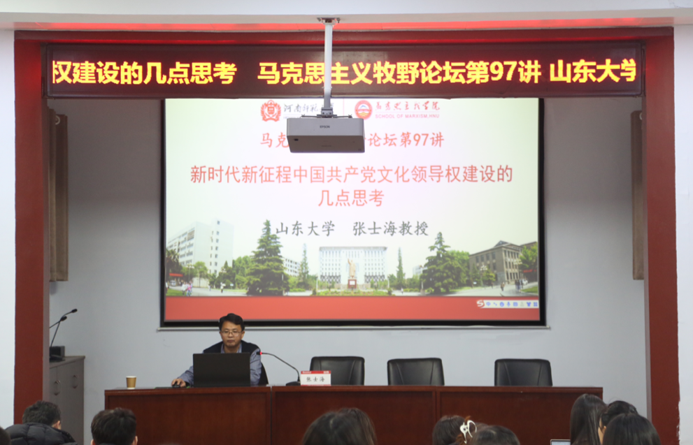 1月8日上午,山东大学马克思主义学院张士海教授应邀为马克思主义学院师生作题为“新时代新征程中国共产党文化领导权建设几点思考”的学术讲座,这也是伟德官网下载苹果版马克思主义牧野论坛第97期。讲座在平原楼108举行。马克思主义学院教师代表和全体硕博研究生参加了此次讲座,此次讲座由马克思主义学院党委书记、院长蒋占峰教授主持。