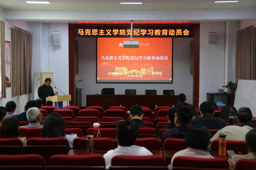 为深入学习贯彻习近平新时代中国特色社会主义思想,高标准高质量开展党纪学习教育,4月16日下午,马克思主义学院在平原楼108会议室召开党纪学习教育动员会。学院全体教职工党员、学生支部书记参加会议,校党委第四巡察组成员张兴乾列席,会议由院党委书记、院长蒋占峰主持。