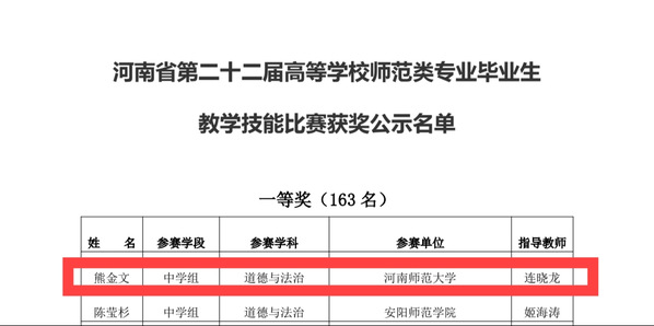 为深入学习贯彻习近平总书记关于教育的重要论述,造就支撑教育强国的高素质教师队伍,10月25日至27日,河南省教育厅主办的第二十二届高等学校师范类专业毕业生教学技能比赛在安阳师范学院举行。马克思主义学院2021级思想政治教育专业学生熊金文,凭借其深厚的专业知识储备与出色的师范技能,历经院赛、校赛的层层选拔,最终在全省决赛中脱颖而出,荣获河南省中学道德与法治组一等奖第一名。