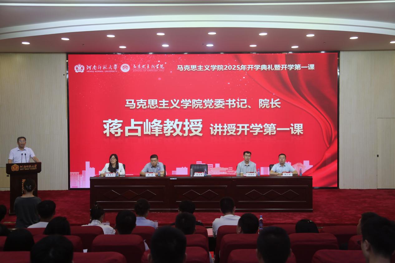 伴随着庄严的《中华人民共和国国歌》,开学典礼正式拉开帷幕。马克思主义学院党委书记、院长蒋占峰教授为全体新生讲授开学第一课。他首先向12名博士生,66名研究生,184名本科生新同学的到来送上诚挚祝贺与热烈欢迎,随后从学院发展历程、历史沿革、师资队伍建设及人才培养特色等维度,为新生们进行了细致讲解。他希望同学们做到“三个坚守”:一是坚守“马院姓马,在马言马”的政治立场,以潜心治学的态度筑牢信仰之基,深刻领会马克思主义中国化时代化的最新成果;二是坚守“明理求是,守正创新”的院训精神,在学习中求真知,在实践中谋创新;三是坚守“知行合一,服务社会”的实践追求,以支教、基层调研等实践活动为载体,把个人成长与国家发展紧密结合,践行“为中华民族伟大复兴贡献青春力量”的誓言。以九三大阅兵展现出的豪情壮志为动力,以马克思主义真理之光为指引,在师大马院这片热土上,书写无悔于时代、无愧于自己的青春篇章!