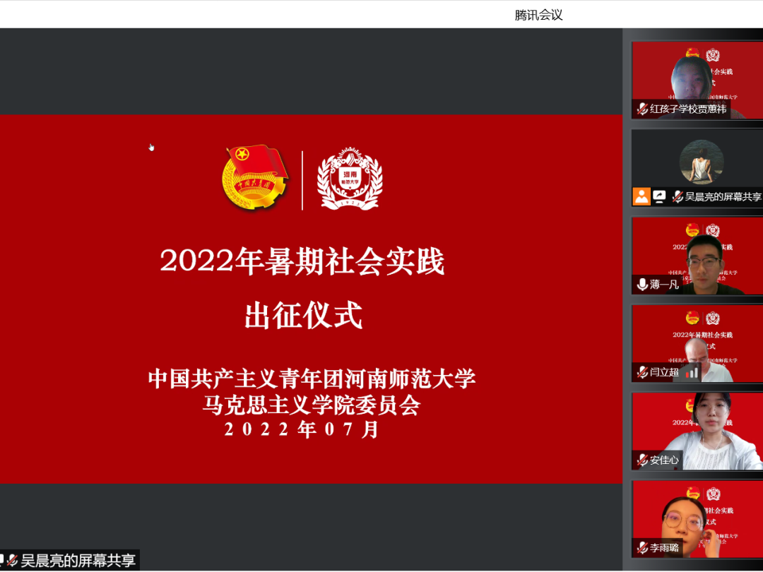 为激励马院学子通过实践活动认识社会、了解国情、增长才干,在实践中坚定理想信念、厚植爱国主义情怀、加强品德修养,2022年7月13日上午,马克思主义学院通过腾讯会议举办2022年暑期社会实践出征仪式。团队指导教师闫立超、薄一凡、尹康、郭豪栋和全体实践团队队员参与本次出征仪式。仪式由吴晨亮主持。